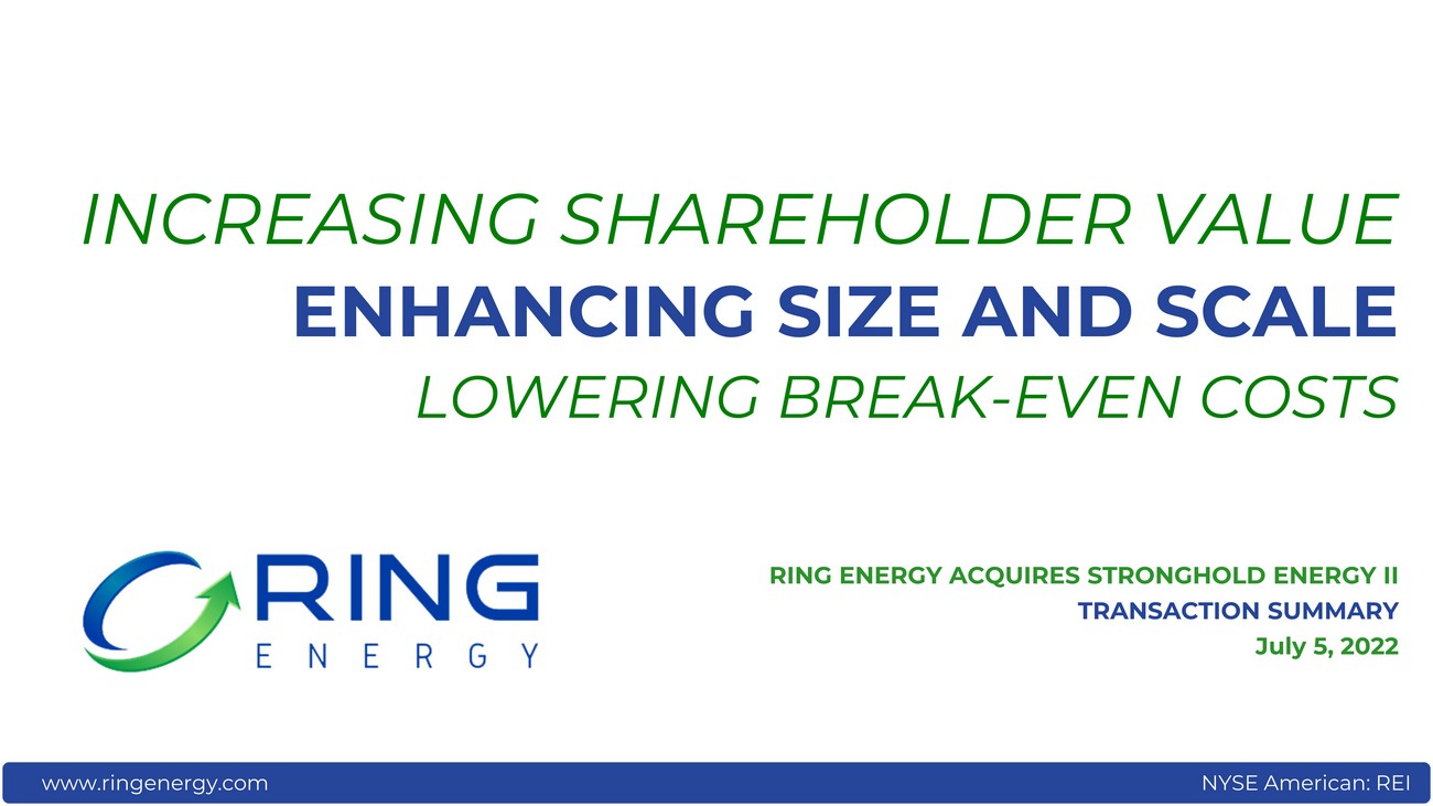 www. ringenergy.com NYSE American: REI RING ENERGY ACQUIRES STRONGHOLD ENERGY II TRANSACTION SUMMARY July 5, 202 2 INCREASING SHAREHOLDER VALUE ENHANCING SIZE AND SCALE LOWERING BREAK - EVEN COSTS