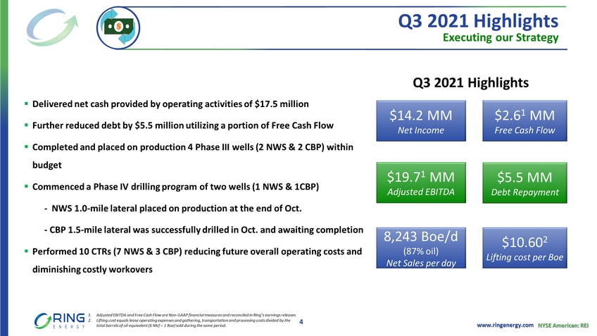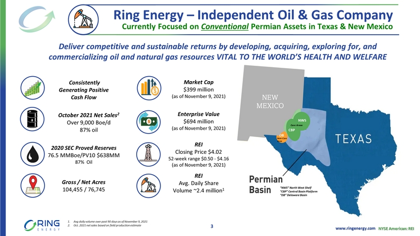 www.ringenergy.com NYSE American: REI Currently Focused on Conventional Permian Assets in Texas & New Mexico 2020 SEC Proved Reserves 76.5 MMBoe /PV10 $638MM 87% Oil October 2021 Net Sales 2 Over 9,000 Boe /d 87% oil Gross / Net Acres 104,455 / 76,745 Ring Energy – Independent Oil & Gas Company Deliver competitive and sustainable returns by developing, acquiring, exploring for, and commercializing oil and natural gas resources VITAL TO THE WORLD’S HEALTH AND WELFARE 1. Avg daily volume over past 90 days as of November 9, 2021 2. Oct. 2021 net sales based on field production estimate 3 Market Cap $399 million (as of November 9, 2021) Consistently Generating Positive Cash Flow NWS CBP DB NEW MEXICO “NWS” North West Shelf “CBP” Central Basin Platform “DB” Delaware Basin Core Areas Non - Core Area Enterprise Value $694 million (as of November 9, 2021) REI Closing Price $4.02 52 - week range $0.50 - $4.16 (as of November 9, 2021) REI Avg. Daily Share Volume ~2.4 million 1