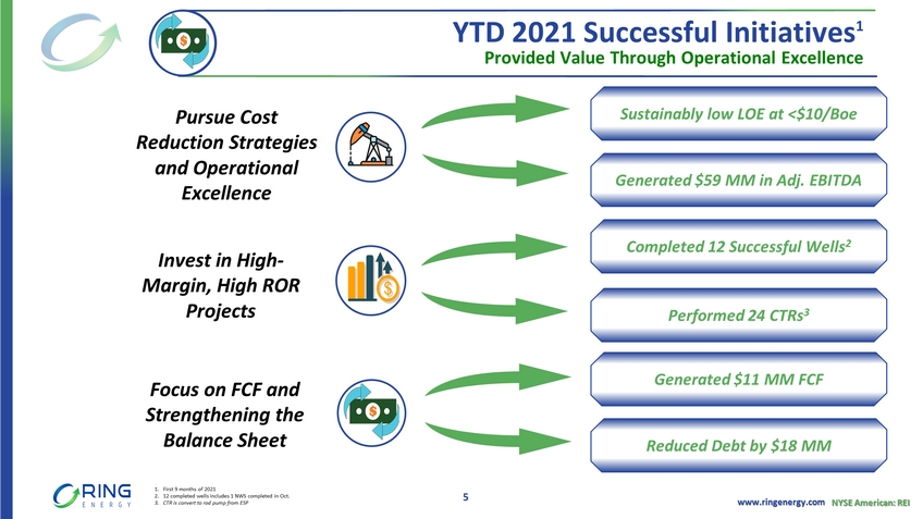 www.ringenergy.com NYSE American: REI Q3 2021 Highlights Executing our Strategy 4 ▪ Delivered net cash provided by operating activities of $17.5 million ▪ Further reduced debt by $5.5 million utilizing a portion of Free Cash Flow ▪ Completed and placed on production 4 Phase III wells (2 NWS & 2 CBP) within budget ▪ Commenced a Phase IV drilling program of two wells (1 NWS & 1CBP) - NWS 1.0 - mile lateral placed on production at the end of Oct. - CBP 1.5 - mile lateral was successfully drilled in Oct. and awaiting completion ▪ Performed 10 CTRs (7 NWS & 3 CBP) reducing future overall operating costs and diminishing costly workovers $2.6 1 MM Free Cash Flow $19.7 1 MM Adjusted EBITDA $14.2 MM Net Income $5.5 MM Debt Repayment 8,243 Boe /d (87% oil) Net Sales per day $10.60 2 Lifting cost per Boe 1. Adjusted EBITDA and Free Cash Flow are Non - GAAP financial measures and reconciled in Ring’s earnings releases 2. Lifting cost equals lease operating expenses and gathering, transportation and processing costs divided by the total barrels of oil equivalent (6 Mcf = 1 Boe ) sold during the same period. Q3 2021 Highlights