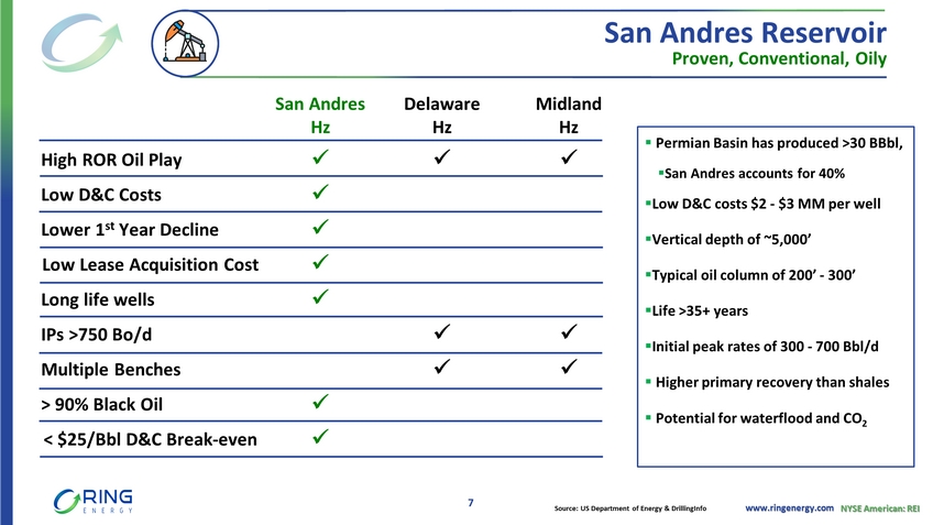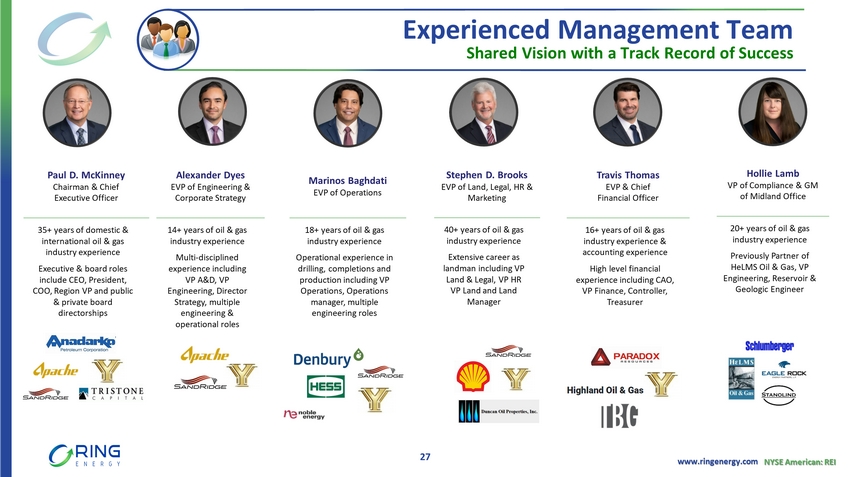 www.ringenergy.com NYSE American: REI Add Photo Add Photo Add Photo Add Photo Add Photo Paul D. McKinney Chairman & Chief Executive Officer 35+ years of domestic & international oil & gas industry experience Executive & board roles include CEO, President, COO, Region VP and public & private board directorships Travis Thomas EVP & Chief Financial Officer 16+ years of oil & gas industry experience & accounting experience High level financial experience including CAO, VP Finance, Controller, Treasurer Alexander Dyes EVP of Engineering & Corporate Strategy 14+ years of oil & gas industry experience Multi - disciplined experience including VP A&D, VP Engineering, Director Strategy, multiple engineering & operational roles Marinos Baghdati EVP of Operations 18+ years of oil & gas industry experience Operational experience in drilling, completions and production including VP Operations, Operations manager, multiple engineering roles Stephen D. Brooks EVP of Land, Legal, HR & Marketing 40+ years of oil & gas industry experience Extensive career as landman including VP Land & Legal, VP HR VP Land and Land Manager Hollie Lamb VP of Compliance & GM of Midland Office 20+ years of oil & gas industry experience Previously Partner of HeLMS Oil & Gas, VP Engineering, Reservoir & Geologic Engineer Experienced Management Team Shared Vision with a Track Record of Success 27