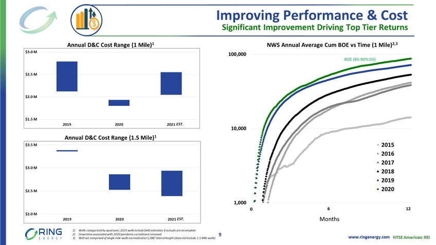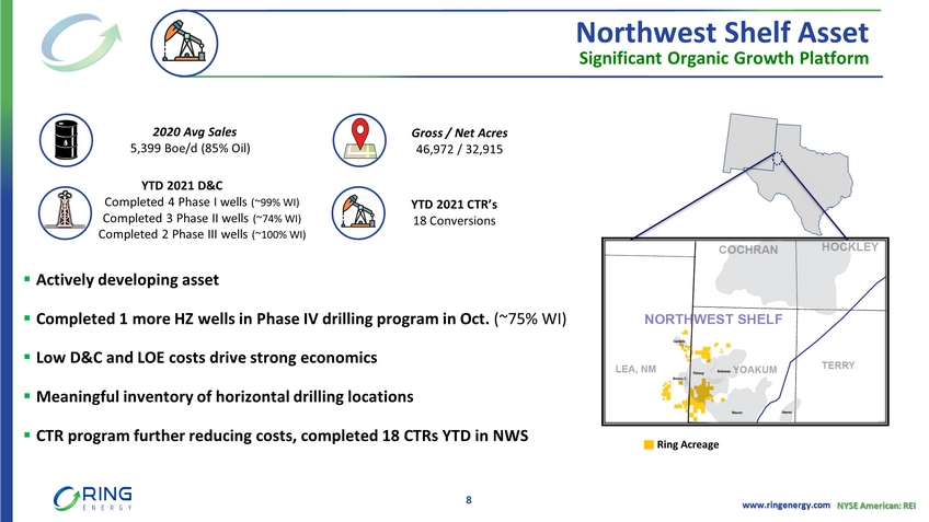 www.ringenergy.com NYSE American: REI Significant Organic Growth Platform 2020 Avg Sales 5,399 Boe /d (85% Oil) YTD 2021 D&C Completed 4 Phase I wells (~99% WI) Completed 3 Phase II wells (~74% WI) Completed 2 Phase III wells (~100% WI) Gross / Net Acres 46,972 / 32,915 ▪ Actively developing asset ▪ Completed 1 more HZ wells in Phase IV drilling program in Oct. (~75% WI) ▪ Low D&C and LOE costs drive strong economics ▪ Meaningful inventory of horizontal drilling locations ▪ CTR program further reducing costs, completed 18 CTRs YTD in NWS Northwest Shelf Asset 8 YTD 2021 CTR’s 18 Conversions Ring Acreage