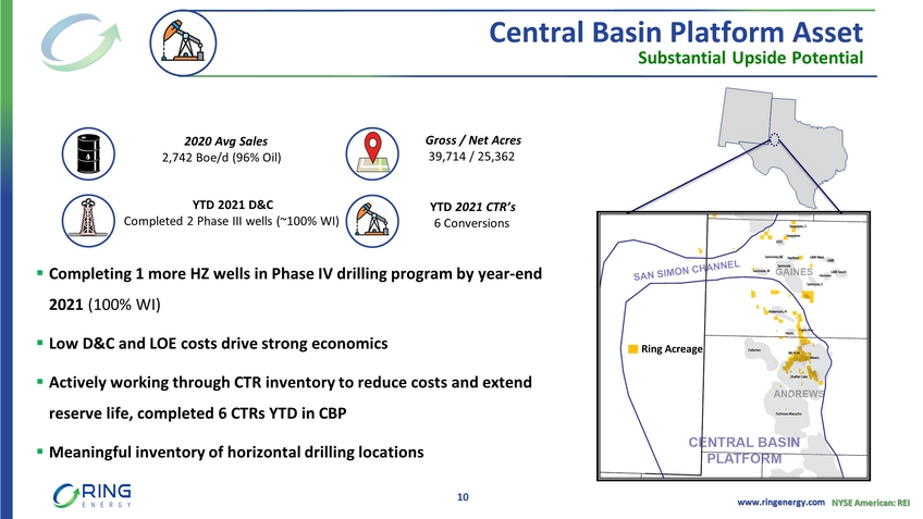 www.ringenergy.com NYSE American: REI ▪ Completing 1 more HZ wells in Phase IV drilling program by year - end 2021 (100% WI) ▪ Low D&C and LOE costs drive strong economics ▪ Actively working through CTR inventory to reduce costs and extend reserve life, completed 6 CTRs YTD in CBP ▪ Meaningful inventory of horizontal drilling locations 2020 Avg Sales 2,742 Boe /d (96% Oil) YTD 2021 CTR’s 6 Conversions YTD 2021 D&C Completed 2 Phase III wells (~100% WI) Gross / Net Acres 39,714 / 25,362 Substantial Upside Potential Central Basin Platform Asset 10 Ring Acreage