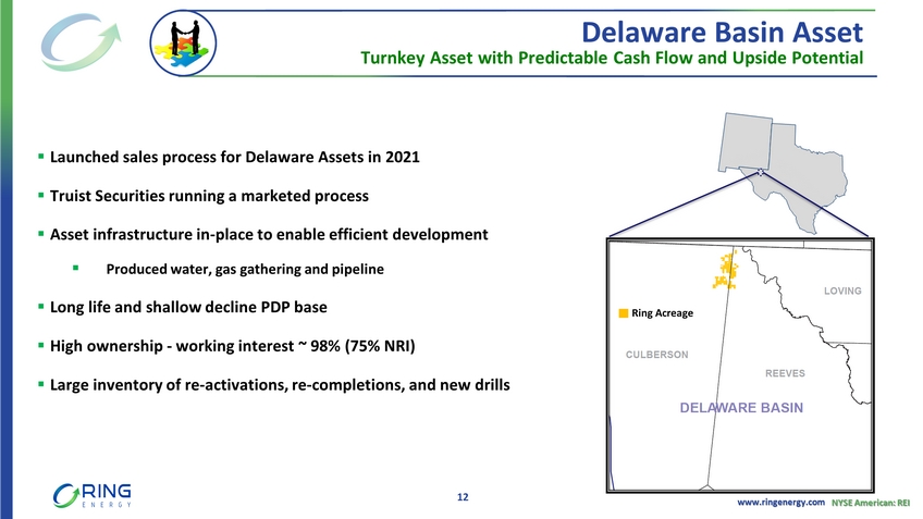 www.ringenergy.com NYSE American: REI Turnkey Asset with Predictable Cash Flow and Upside Potential Delaware Basin Asset 12 ▪ Launched sales process for Delaware Assets in 2021 ▪ Truist Securities running a marketed process ▪ Asset infrastructure in - place to enable efficient development ▪ Produced water, gas gathering and pipeline ▪ Long life and shallow decline PDP base ▪ High ownership - working interest ~ 98% (75% NRI) ▪ Large inventory of re - activations, re - completions, and new drills Ring Acreage