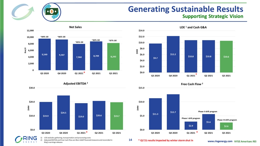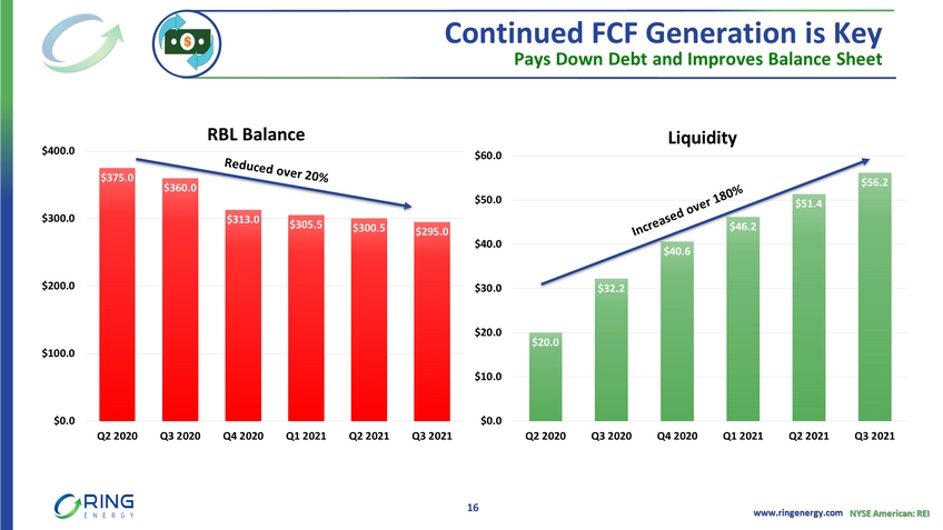 www.ringenergy.com NYSE American: REI Historical Metrics Quarterly Analysis of FCF 1 $MM Q3 2020 Q4 2020 Q1 2021 Q2 2021 Q3 2021 Adj EBITDA 1 $19.9 $24.5 $19.0 $20.6 $19.7 Capital - $4.3 - $7.8 - $14.5 - $11.5 - $13.7 Interest Exp. 2 - $4.3 - $4.0 - $3.6 - $3.5 - $3.4 Proceeds from Divestiture $2.0 Free Cash Flow 1 $11.3 $12.7 $2.9 $5.6 $2.6 15 $19.9 $24.5 $19.0 $20.6 $19.7 - $4.3 - $7.8 - $14.5 - $11.5 - $13.7 - $4.3 - $4.0 - $3.6 - $3.5 - $3.4 $11.3 $12.7 $2.9 $5.6 $2.6 -$30.0 -$20.0 -$10.0 $0.0 $10.0 $20.0 $30.0 Q3 2020 Q4 2020 Q1 2021 Q2 2021 Q3 2021 EBITDA/ Capital / Int Exp Adj EBITDA $MM Capital $MM Interest Exp $MM Proceeds from Divestiture $MM Free Cash Flow $MM ▪ Disciplined capital spending ▪ Prioritizing FCF generation ▪ Unrelenting goal to strengthen the balance sheet 1) Adjusted EBITDA and Free Cash Flow are Non - GAAP financial measures and reconciled in Ring’s earnings releases 2) Excludes amortization of deferred financing costs