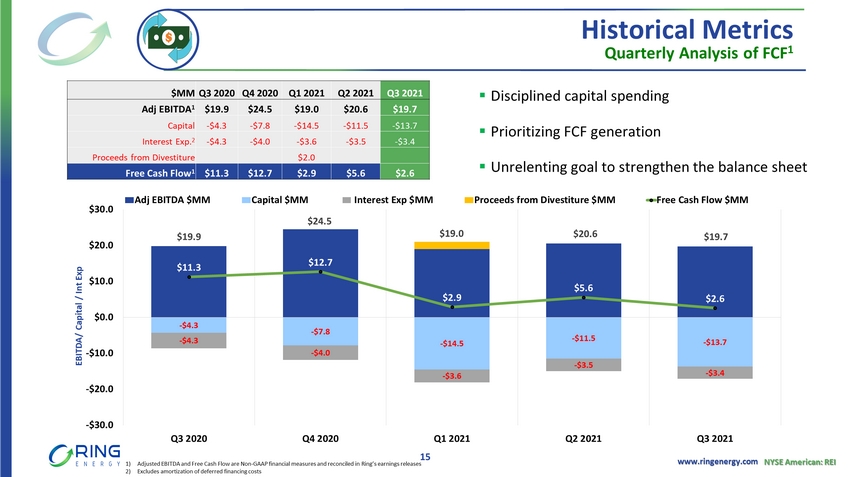 www.ringenergy.com NYSE American: REI Generating Sustainable Results 9,549 9,307 7,960 8,709 8,243 0 2,000 4,000 6,000 8,000 10,000 12,000 Q3 2020 Q4 2020 Q1 2021 Q2 2021 Q3 2021 Boe /d Net Sales $9.7 $12.2 $10.8 $10.8 $10.6 $0.0 $2.0 $4.0 $6.0 $8.0 $10.0 $12.0 $14.0 Q3 2020 Q4 2020 Q1 2021 Q2 2021 Q3 2021 $MM LOE 1 and Cash G&A $19.9 $24.5 $19.0 $20.6 $19.7 $0.0 $10.0 $20.0 $30.0 Q3 2020 Q4 2020 Q1 2021 Q2 2021 Q3 2021 $MM Adjusted EBITDA 2 $11.3 $12.7 $2.9 $5.6 $2.6 $0.0 $5.0 $10.0 $15.0 Q3 2020 Q4 2020 Q1 2021 Q2 2021 Q3 2021 $MM Free Cash Flow 2 Supporting Strategic Vision 14 1) LOE excludes gathering, transportation and processing costs 2) Adjusted EBITDA and Free Cash Flow are Non - GAAP financial measures and reconciled in Ring’s earnings releases * Q1’21 results impacted by winter storm shut in Phase I drill program * * * * Phase II drill program ~87% Oil ~89% Oil ~85% Oil ~86% Oil ~89% Oil Phase III drill program