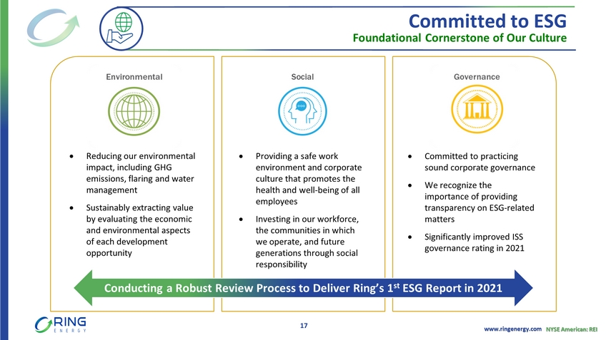 www.ringenergy.com NYSE American: REI $375.0 $360.0 $313.0 $305.5 $300.5 $295.0 $0.0 $100.0 $200.0 $300.0 $400.0 Q2 2020 Q3 2020 Q4 2020 Q1 2021 Q2 2021 Q3 2021 RBL Balance $313 MM outstanding debt with $36 MM in Surplus Cash Continued FCF Generation is Key Pays Down Debt and Improves Balance Sheet 16 $20.0 $32.2 $40.6 $46.2 $51.4 $56.2 $0.0 $10.0 $20.0 $30.0 $40.0 $50.0 $60.0 Q2 2020 Q3 2020 Q4 2020 Q1 2021 Q2 2021 Q3 2021 Liquidity