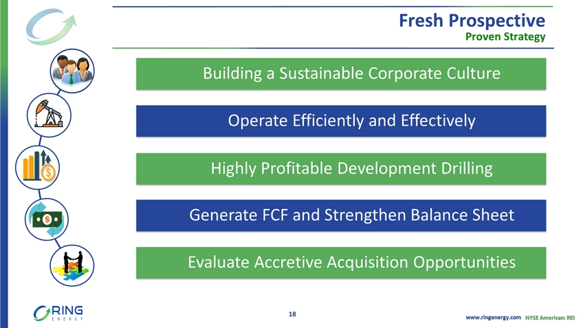 www.ringenergy.com NYSE American: REI Committed to ESG Foundational Cornerstone of Our Culture 17 Providing a safe work environment and corporate culture that promotes the health and well - being of all employees Investing in our workforce, the communities in which we operate, and future generations through social responsibility Committed to practicing sound corporate governance We recognize the importance of providing transparency on ESG - related matters Significantly improved ISS governance rating in 2021 Reducing our environmental impact, including GHG emissions, flaring and water management Sustainably extracting value by evaluating the economic and environmental aspects of each development opportunity Conducting a Robust Review Process to Deliver Ring’s 1 st ESG Report in 2021