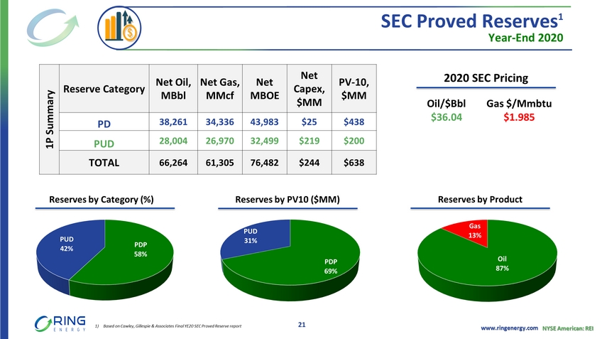 www.ringenergy.com NYSE American: REI 38% 54% 8% D&C CTRs/Recomp/Cap Workovers Land/Other CAPEX Allocation Mid Point $13 million Q4 2021 Guidance Maintain Production, Generate FCF, Pay Down Debt 20 Sales Volumes Q4 2021 Total ( Boe /d) 8,800 – 9,200 Oil (Bo/d) 7,500 – 7,900 Operating Expenses (per Boe ) Q4 2021 Lifting Cost 1 $10.50 - $11.50 Capital Spending ($ in millions) Q4 2021 Number of new wells drilled 2 Number of new wells completed 2 Capital Spending $11 - $15 1. Lifting cost equals lease operating expenses and gathering, transportation and processing costs divided by the total barrels of oil equivalent (6 Mcf = 1 Boe ) sold during the same period.