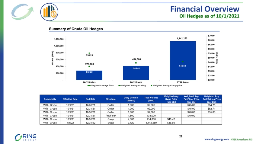 www.ringenergy.com NYSE American: REI Commodity Effective Date End Date Structure Daily Volume (Bbls/d) Total Volume (Bbls) Weighted Avg. Swap Price (per Bbl) Weighted Avg. Put/Floor Price (per Bbl) Weighted Avg. Call/Ceiling Price (per Bbl) WTI - Crude 10/1/21 12/31/21 Collar 1,000 92,000 $45.00 $54.75 WTI - Crude 10/1/21 12/31/21 Collar 1,000 92,000 $45.00 $52.71 WTI - Crude 10/1/21 12/31/21 Collar 1,000 92,000 $40.00 $55.08 WTI - Crude 10/1/21 12/31/21 Put/Floor 1,500 138,000 $40.00 WTI - Crude 10/1/21 12/31/21 Swap 4,500 414,000 $45.42 WTI - Crude 1/1/22 12/31/22 Swap 3,129 1,142,250 $46.60 Financial Overview Oil Hedges as of 10/1/2021 Summary of Crude Oil Hedges 276,000 414,000 1,142,250 $42.22 $54.25 $45.42 $46.60 $30.00 $34.00 $38.00 $42.00 $46.00 $50.00 $54.00 $58.00 $62.00 $66.00 $70.00 - 200,000 400,000 600,000 800,000 1,000,000 1,200,000 Bal'21 Collars Bal'21 Swaps FY'22 Swaps Price ($/Bbl) Volume (Bbls) Weighted Average Floor Weighted Average Ceiling Weighted Average Swap price 22