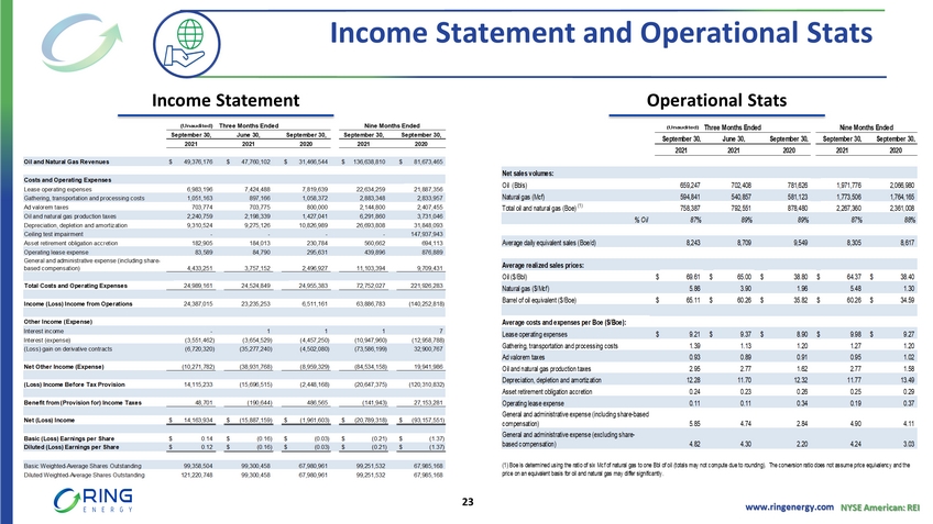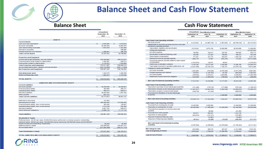 www.ringenergy.com NYSE American: REI Income Statement and Operational Stats 23 Income Statement Operational Stats Oil and Natural Gas Revenues $ 49,376,176 $ 47,760,102 $ 31,466,544 $ 136,638,810 $ 81,673,465 Costs and Operating Expenses Lease operating expenses 6,983,196 7,424,488 7,819,639 22,634,259 21,887,356 Gathering, transportation and processing costs 1,051,163 897,166 1,058,372 2,883,348 2,833,957 Ad valorem taxes 703,774 703,775 800,000 2,144,800 2,407,455 Oil and natural gas production taxes 2,240,759 2,198,339 1,427,041 6,291,860 3,731,046 Depreciation, depletion and amortization 9,310,524 9,275,126 10,826,989 26,693,808 31,848,093 Ceiling test impairment - - - - 147,937,943 Asset retirement obligation accretion 182,905 184,013 230,784 560,662 694,113 Operating lease expense 83,589 84,790 295,631 439,896 876,889 General and administrative expense (including share- based compensation) 4,433,251 3,757,152 2,496,927 11,103,394 9,709,431 Total Costs and Operating Expenses 24,989,161 24,524,849 24,955,383 72,752,027 221,926,283 Income (Loss) Income from Operations 24,387,015 23,235,253 6,511,161 63,886,783 (140,252,818) Other Income (Expense) Interest income - 1 1 1 7 Interest (expense) (3,551,462) (3,654,529) (4,457,250) (10,947,960) (12,958,788) (Loss) gain on derivative contracts (6,720,320) (35,277,240) (4,502,080) (73,586,199) 32,900,767 Net Other Income (Expense) (10,271,782) (38,931,768) (8,959,329) (84,534,158) 19,941,986 (Loss) Income Before Tax Provision 14,115,233 (15,696,515) (2,448,168) (20,647,375) (120,310,832) Benefit from (Provision for) Income Taxes 48,701 (190,644) 486,565 (141,943) 27,153,281 Net (Loss) Income $ 14,163,934 $ (15,887,159) $ (1,961,603) $ (20,789,318) $ (93,157,551) Basic (Loss) Earnings per Share $ 0.14 $ (0.16) $ (0.03) $ (0.21) $ (1.37) Diluted (Loss) Earnings per Share $ 0.12 $ (0.16) $ (0.03) $ (0.21) $ (1.37) Basic Weighted-Average Shares Outstanding 99,358,504 99,300,458 67,980,961 99,251,532 67,985,168 Diluted Weighted-Average Shares Outstanding 121,220,748 99,300,458 67,980,961 99,251,532 67,985,168 2021 2021 2020 2021 2020 Three Months Ended Nine Months Ended September 30, September 30,September 30, June 30, September 30, ASSETS Current Assets Cash and cash equivalents $ 2,046,946 $ 3,578,634 Accounts receivable 20,306,264 14,997,979 Joint interest billing receivable 1,672,334 1,327,262 Derivative receivable - 499,906 Prepaid expenses and retainers 1,298,801 396,109 Total Current Assets 25,324,345 20,799,890 Properties and Equipment Oil and natural gas properties, full cost method 872,258,987 836,514,815 Financing lease asset subject to depreciation 1,422,487 858,513 Fixed assets subject to depreciation 2,130,523 1,520,890 Total Properties and Equipment 875,811,997 838,894,218 Accumulated depreciation, depletion and amortization (225,744,692) (200,111,658) Net Properties and Equipment 650,067,305 638,782,560 Operating lease asset 1,344,378 1,494,399 Deferred financing costs 1,882,815 2,379,348 TOTAL ASSETS $ 678,618,843 $ 663,456,197 LIABILITIES AND STOCKHOLDERS' EQUITY Current Liabilities Accounts payable $ 45,259,500 $ 32,500,081 Financing lease liability 385,866 295,311 Operating lease liability 268,512 859,017 Derivative liabilities 38,402,944 3,287,328 Notes payable 857,151 - Total Current Liabilities 85,173,973 36,941,737 Deferred income taxes 141,943 - Revolving line of credit 295,000,000 313,000,000 Financing lease liability, less current portion 393,340 126,857 Operating lease liability, less current portion 1,212,239 635,382 Derivative liabilities 6,061,724 869,273 Asset retirement obligations 14,998,130 17,117,135 Total Liabilities 402,981,349 368,690,384 Stockholders' Equity Preferred stock - $0.001 par value; 50,000,000 shares authorized; no shares issued or outstanding - - Common stock - $0.001 par value; 150,000,000 shares authorized; 99,359,938 shares and 85,568,287 shares issued and outstanding, respectively 99,360 85,568 Additional paid-in capital 552,598,622 550,951,415 Accumulated deficit (277,060,488) (256,271,170) Total Stockholders' Equity 275,637,494 294,765,813 TOTAL LIABILITIES AND STOCKHOLDERS' EQUITY $ 678,618,843 $ 663,456,197 September 30, December 31, (Unaudited) 2021 2020