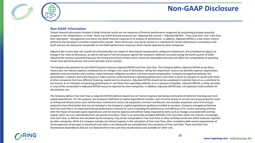 www.ringenergy.com NYSE American: REI Non - GAAP Disclosure 25 Non - GAAP Information Certain financial information included in Ring’s financial results are not measures of financial performance recognized by ac cou nting principles generally accepted in the United States, or GAAP. These non - GAAP financial measures are “Adjusted Net Income”, “Adjusted EBITDA”, “Free Ca sh Flow” and “Cash Flow from Operations”. Management uses these non - GAAP financial measures in its analysis of performance. In addition, Adjusted EBITDA is a key metric used to determine the Company’s incentive compensation awards. These disclosures may not be viewed as a substitute for results determ ine d in accordance with GAAP and are not necessarily comparable to non - GAAP performance measures which may be reported by other companies. Adjusted Net Income does not include the estimated after - tax impact of share - based compensation, ceiling test impairment, and un realized loss (gain) on change in fair value of derivatives, as well an add back of the full valuation against the Company’s deferred tax assets duri ng the fourth quarter of 2020. Adjusted Net Income is presented because the timing and amount of these items cannot be reasonably estimated and affect the c omp arability of operating results from period to period, and current periods to prior periods. The Company also presents the non - GAAP financial measures Adjusted EBITDA and Free Cash Flow. The Company defines Adjusted EBITD A as net (loss) income plus net interest expense, unrealized loss on change in fair value of derivatives, ceiling test impairment, income tax (b enefit) expense, depreciation, depletion and amortization and accretion, asset retirement obligation accretion and share - based compensation. Company management believes this presentation is relevant and useful because it helps investors understand Ring’s operating performance and makes it easier to co mpare its results with those of other companies that have different financing, capital and tax structures. Adjusted EBITDA should not be considered in iso lat ion from or as a substitute for net income, as an indication of operating performance or cash flows from operating activities or as a measure of liquidity. A dju sted EBITDA, as Ring calculates it, may not be comparable to Adjusted EBITDA measures reported by other companies. In addition, Adjusted EBITDA does not repr ese nt funds available for discretionary use. The Company defines Free Cash Flow as Adjusted EBITDA (defined above) less net interest expense (excluding amortization of de fer red financing cost) and capital expenditures. For this purpose, the Company’s definition of capital expenditures includes costs incurred related to o il and natural gas properties (such as drilling and infrastructure costs and the lease maintenance costs) and equipment, furniture and fixtures, but excludes acq uis ition costs of oil and gas properties from third parties that are not included in the Company’s capital expenditures guidance provided to investors. Com pan y management believes that Free Cash Flow is an important financial performance measure for use in evaluating the performance and efficiency of its cu rrent operating activities after the impact of accrued capital expenditures and net interest expense and without being impacted by items such as changes as sociated with working capital, which can vary substantially from one period to another. There is no commonly accepted definition Free Cash Flow wit hin the industry. Accordingly, Free Cash Flow, as defined and calculated by the Company, may not be comparable to Free Cash Flow or other similarly named no n - G AAP measures reported by other companies. While the Company includes net interest expense in the calculation of Free Cash Flow, other mandatory deb t s ervice requirements of future payments of principal at maturity (if such debt is not refinanced) are excluded from the calculation of Free Cash Flow . T hese and other non - discretionary expenditures that are not deducted from Free Cash Flow would reduce cash available for other uses.