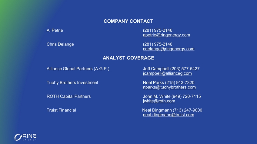 ANALYST COVERAGE Alliance Global Partners (A.G.P.) Jeff Campbell (203) 577 - 5427 jcampbell@allianceg.com Tuohy Brothers Investment Noel Parks (215) 913 - 7320 nparks@tuohybrothers.com ROTH Capital Partners John M. White (949) 720 - 7115 jwhite@roth.com Truist Financial Neal Dingmann (713) 247 - 9000 neal.dingmann@truist.com COMPANY CONTACT Al Petrie (281) 975 - 2146 apetrie@ringenergy.com Chris Delange (281) 975 - 2146 cdelange @ringenergy.com