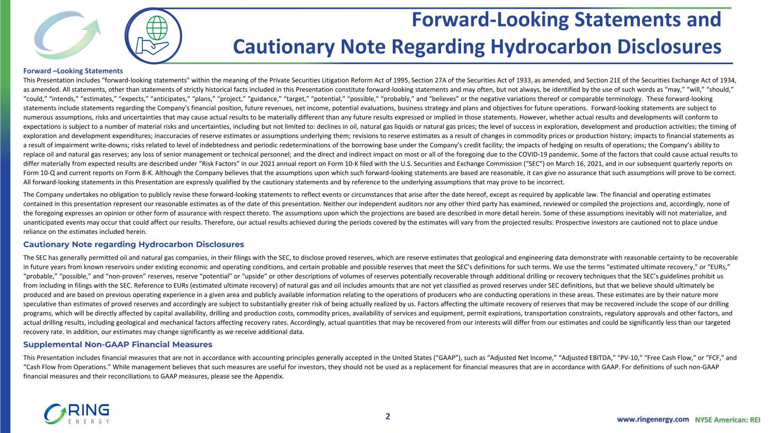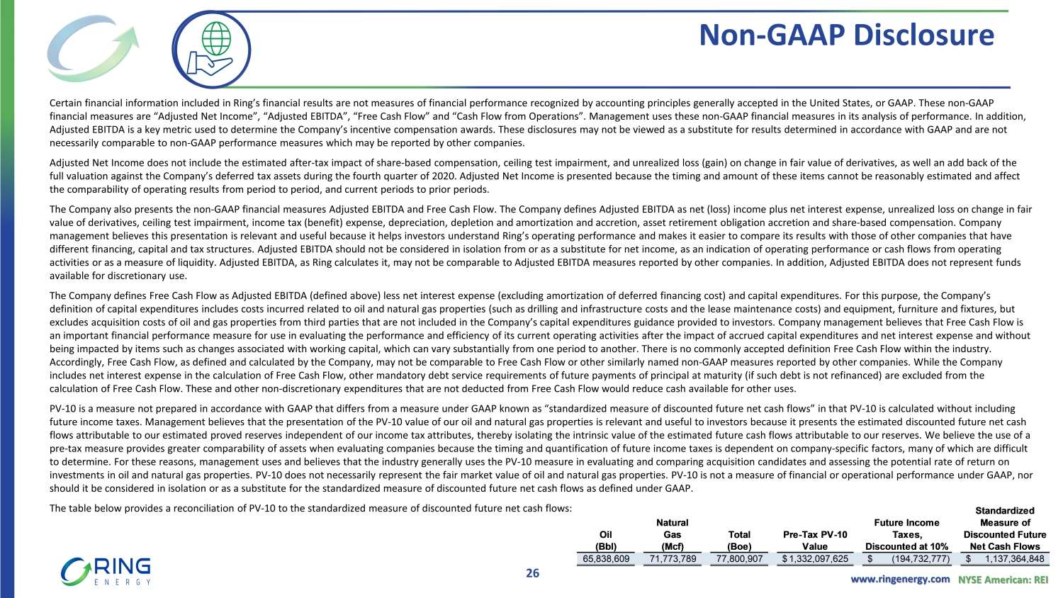 www.ringenergy.com NYSE American: REI Non - GAAP Disclosure Certain financial information included in Ring’s financial results are not measures of financial performance recognized by ac cou nting principles generally accepted in the United States, or GAAP. These non - GAAP financial measures are “Adjusted Net Income”, “Adjusted EBITDA”, “Free Cash Flow” and “Cash Flow from Operations”. Management us es these non - GAAP financial measures in its analysis of performance. In addition, Adjusted EBITDA is a key metric used to determine the Company’s incentive compensation awards. These disclosures may not be v iew ed as a substitute for results determined in accordance with GAAP and are not necessarily comparable to non - GAAP performance measures which may be reported by other companies. Adjusted Net Income does not include the estimated after - tax impact of share - based compensation, ceiling test impairment, and un realized loss (gain) on change in fair value of derivatives, as well an add back of the full valuation against the Company’s deferred tax assets during the fourth quarter of 2020. Adjusted Net Income is presented bec ause the timing and amount of these items cannot be reasonably estimated and affect the comparability of operating results from period to period, and current periods to prior periods. The Company also presents the non - GAAP financial measures Adjusted EBITDA and Free Cash Flow. The Company defines Adjusted EBITD A as net (loss) income plus net interest expense, unrealized loss on change in fair value of derivatives, ceiling test impairment, income tax (benefit) expense, depreciation, depletion and amortization and acc ret ion, asset retirement obligation accretion and share - based compensation. Company management believes this presentation is relevant and useful because it helps investors understand Ring’s operating performan ce and makes it easier to compare its results with those of other companies that have different financing, capital and tax structures. Adjusted EBITDA should not be considered in isolation from or as a substitut e f or net income, as an indication of operating performance or cash flows from operating activities or as a measure of liquidity. Adjusted EBITDA, as Ring calculates it, may not be comparable to Adjusted EBITDA mea sur es reported by other companies. In addition, Adjusted EBITDA does not represent funds available for discretionary use. The Company defines Free Cash Flow as Adjusted EBITDA (defined above) less net interest expense (excluding amortization of de fer red financing cost) and capital expenditures. For this purpose, the Company’s definition of capital expenditures includes costs incurred related to oil and natural gas properties (such as drilling and in fra structure costs and the lease maintenance costs) and equipment, furniture and fixtures, but excludes acquisition costs of oil and gas properties from third parties that are not included in the Company’s capital expend itu res guidance provided to investors. Company management believes that Free Cash Flow is an important financial performance measure for use in evaluating the performance and efficiency of its current operating acti vit ies after the impact of accrued capital expenditures and net interest expense and without being impacted by items such as changes associated with working capital, which can vary substantially from one period to anot her . There is no commonly accepted definition Free Cash Flow within the industry. Accordingly, Free Cash Flow, as defined and calculated by the Company, may not be comparable to Free Cash Flow or other simil arl y named non - GAAP measures reported by other companies. While the Company includes net interest expense in the calculation of Free Cash Flow, other mandatory debt service requirements of future payme nts of principal at maturity (if such debt is not refinanced) are excluded from the calculation of Free Cash Flow. These and other non - discretionary expenditures that are not deducted from Free Cash Flow would re duce cash available for other uses. PV - 10 is a measure not prepared in accordance with GAAP that differs from a measure under GAAP known as “standardized measure of discounted future net cash flows” in that PV - 10 is calculated without including future income taxes. Management believes that the presentation of the PV - 10 value of our oil and natural gas properties is relev ant and useful to investors because it presents the estimated discounted future net cash flows attributable to our estimated proved reserves independent of our income tax attributes, thereby isolating the intrinsic va lue of the estimated future cash flows attributable to our reserves. We believe the use of a pre - tax measure provides greater comparability of assets when evaluating companies because the timing and quantification of futu re income taxes is dependent on company - specific factors, many of which are difficult to determine. For these reasons, management uses and believes that the industry generally uses the PV - 10 measure in evaluating a nd comparing acquisition candidates and assessing the potential rate of return on investments in oil and natural gas properties. PV - 10 does not necessarily represent the fair market value of oil and natural gas properties. PV - 10 is not a measure of financial or operational performance under GAAP, nor should it be considered in isolation or as a substitute for the standardized measure of discounted future net cash flows as d efi ned under GAAP. The table below provides a reconciliation of PV - 10 to the standardized measure of discounted future net cash flows: 26