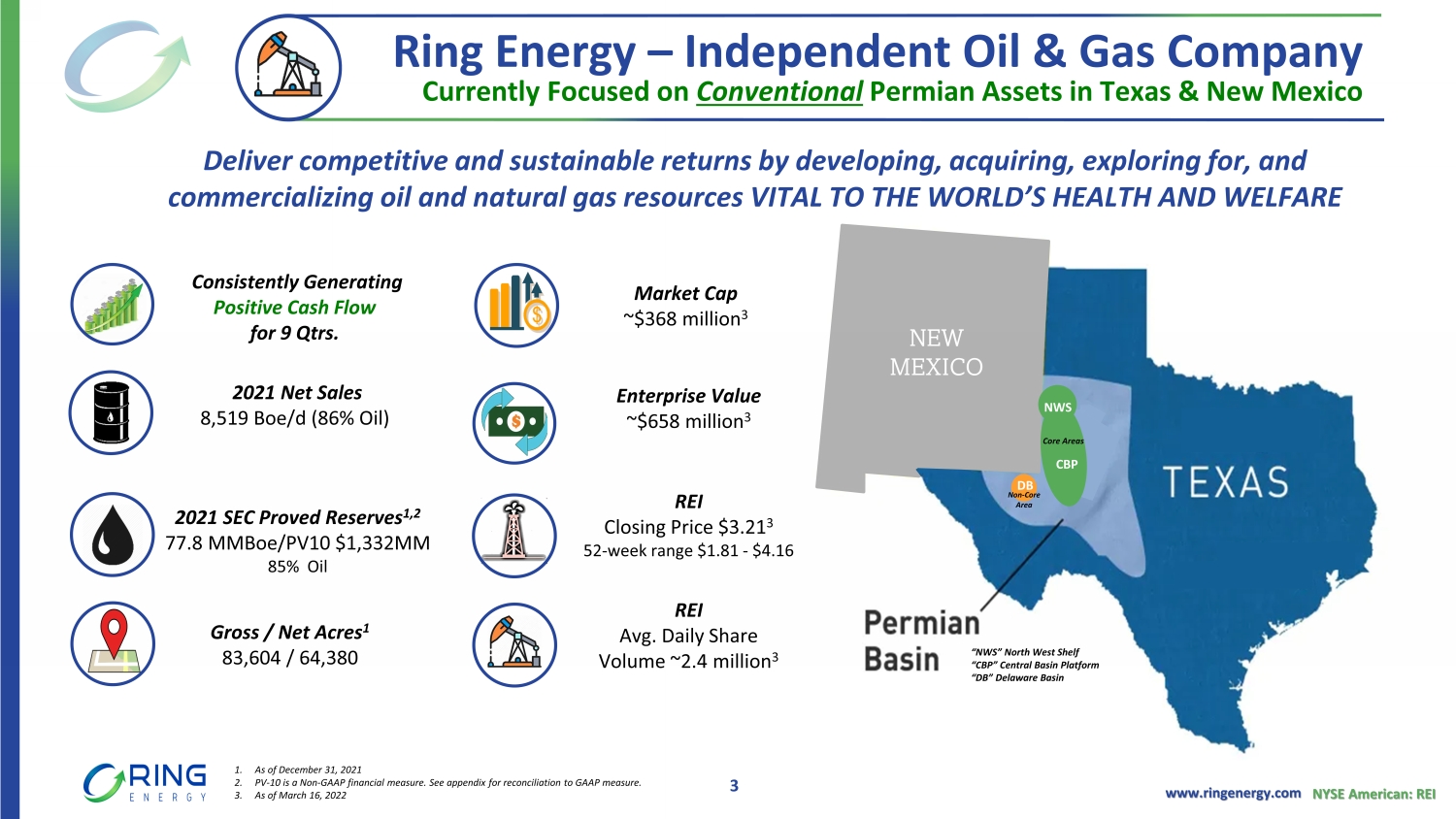 www.ringenergy.com NYSE American: REI Forward - Looking Statements and Cautionary Note Regarding Hydrocarbon Disclosures 2 Forward – Looking Statements This Presentation includes "forward - looking statements" within the meaning of the Private Securities Litigation Reform Act of 19 95, Section 27A of the Securities Act of 1933, as amended, and Section 21E of the Securities Exchange Act of 1934, as amended. All statements, other than statements of strictly historical facts included in this Presentation constitute forwa rd - looking statements and may often, but not always, be identified by the use of such words as “may,” “will,” “should,” “could,” “intends,” “estimates,” “expects,” “anticipates,” “plans,” “project,” “guidance,” “target,” “potential,” “possible,” “p robably,” and “believes” or the negative variations thereof or comparable terminology. These forward - looking statements include statements regarding the Company's financial position, future revenues, net income, potential evaluations, bu siness strategy and plans and objectives for future operations. Forward - looking statements are subject to numerous assumptions, risks and uncertainties that may cause actual results to be materially different than any future result s e xpressed or implied in those statements. However, whether actual results and developments will conform to expectations is subject to a number of material risks and uncertainties, including but not limited to: declines in oil, natur al gas liquids or natural gas prices; the level of success in exploration, development and production activities; the timing of exploration and development expenditures; inaccuracies of reserve estimates or assumptions underlying them; revisions to rese rve estimates as a result of changes in commodity prices or production history; impacts to financial statements as a result of impairment write - downs; risks related to level of indebtedness and periodic redeterminations of the borrowing base u nder the Company’s credit facility; the impacts of hedging on results of operations; the Company’s ability to replace oil and natural gas reserves; any loss of senior management or technical personnel; and the direct and indirect impac t o n most or all of the foregoing due to the COVID - 19 pandemic. Some of the factors that could cause actual results to differ materially from expected results are described under “Risk Factors” in our 2021 annual report on Form 10 - K filed with the U.S. Securities and Exchange Commission (“SEC”) on March 16, 2021, and in our subsequent quarterly reports on Form 10 - Q and current reports on Form 8 - K. Although the Company believes that the assumptions upon which such forward - looking st atements are based are reasonable, it can give no assurance that such assumptions will prove to be correct. All forward - looking statements in this Presentation are expressly qualified by the cautionary statements and by reference to the underlying assumptions that may prove to be incorrect. The Company undertakes no obligation to publicly revise these forward - looking statements to reflect events or circumstances that arise after the date hereof, except as required by applicable law. The financial and operating estimates contained in this presentation represent our reasonable estimates as of the date of this presentation. Neither our independen t a uditors nor any other third party has examined, reviewed or compiled the projections and, accordingly, none of the foregoing expresses an opinion or other form of assurance with respect thereto. The assumptions upon which the projection s a re based are described in more detail herein. Some of these assumptions inevitably will not materialize, and unanticipated events may occur that could affect our results. Therefore, our actual results achieved during the periods cover ed by the estimates will vary from the projected results. Prospective investors are cautioned not to place undue reliance on the estimates included herein. Cautionary Note regarding Hydrocarbon Disclosures The SEC has generally permitted oil and natural gas companies, in their filings with the SEC, to disclose proved reserves, wh ich are reserve estimates that geological and engineering data demonstrate with reasonable certainty to be recoverable in future years from known reservoirs under existing economic and operating conditions, and certain probable and possible res erv es that meet the SEC’s definitions for such terms. We use the terms “estimated ultimate recovery,” or “EURs,” “probable,” “possible,” and “non - proven” reserves, reserve “potential” or “upside” or other descriptions of volumes of reserves potentially recoverable through additional drilling or recovery techniques that the SEC’s guidelines prohibit us from including in filings with the SEC. Reference to EURs (estimated ultimate recovery) of natural gas and oil includes amoun ts that are not yet classified as proved reserves under SEC definitions, but that we believe should ultimately be produced and are based on previous operating experience in a given area and publicly available information relating to the op era tions of producers who are conducting operations in these areas. These estimates are by their nature more speculative than estimates of proved reserves and accordingly are subject to substantially greater risk of being actually rea liz ed by us. Factors affecting the ultimate recovery of reserves that may be recovered include the scope of our drilling programs, which will be directly affected by capital availability, drilling and production costs, commodity prices, availabil ity of services and equipment, permit expirations, transportation constraints, regulatory approvals and other factors, and actual drilling results, including geological and mechanical factors affecting recovery rates. Accordingly, actual quantities th