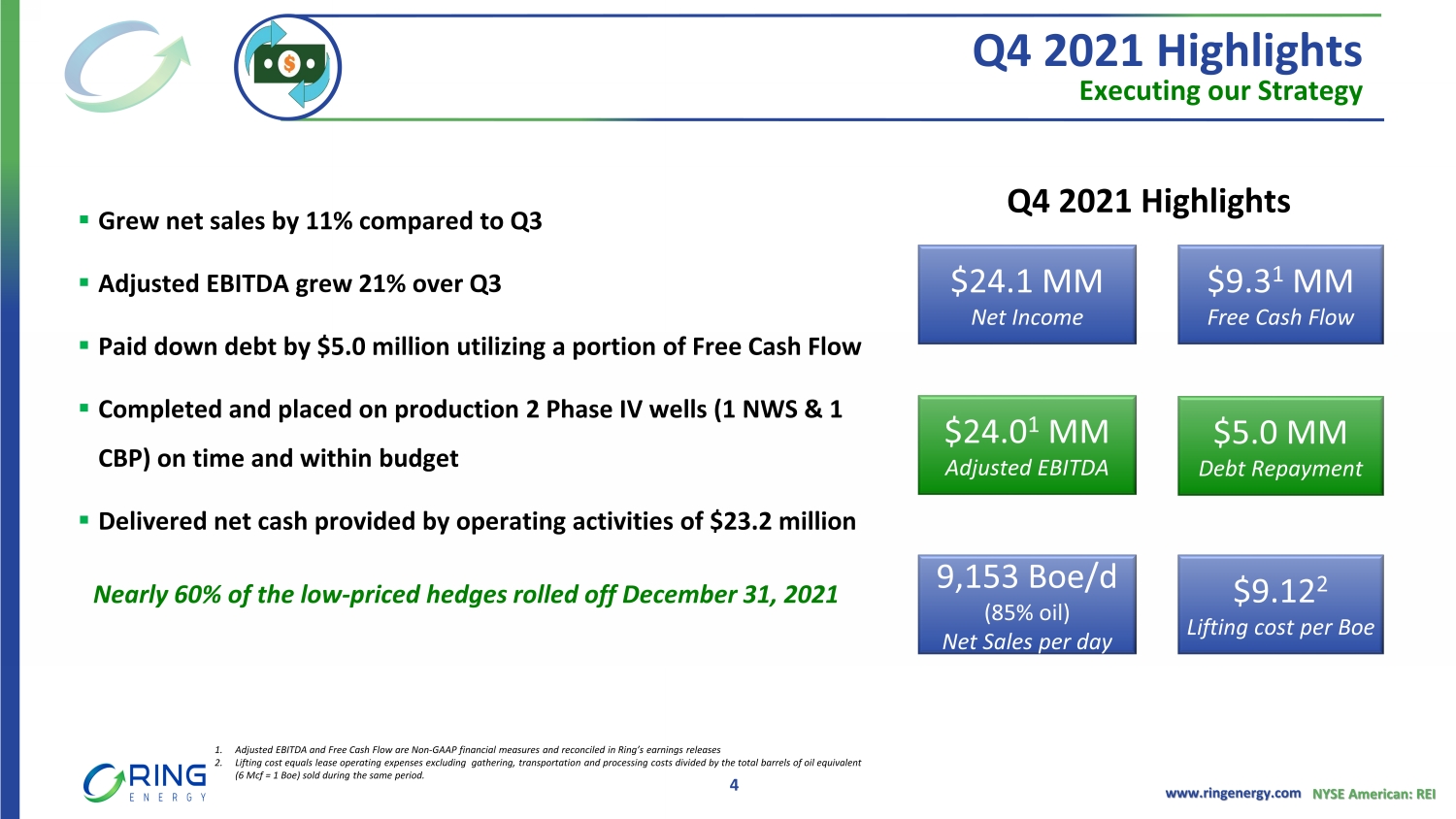 www.ringenergy.com NYSE American: REI Currently Focused on Conventional Permian Assets in Texas & New Mexico 2021 SEC Proved Reserves 1,2 77.8 MMBoe /PV10 $1,332MM 85% Oil 2021 Net Sales 8,519 Boe /d (86% Oil) Gross / Net Acres 1 83,604 / 64,380 Ring Energy – Independent Oil & Gas Company Deliver competitive and sustainable returns by developing, acquiring, exploring for, and commercializing oil and natural gas resources VITAL TO THE WORLD’S HEALTH AND WELFARE 1. As of December 31, 2021 2. PV - 10 is a Non - GAAP financial measure. See appendix for reconciliation to GAAP measure. 3. As of March 16, 2022 3 Market Cap ~$368 million 3 Consistently Generating Positive Cash Flow for 9 Qtrs. NEW MEXICO “NWS” North West Shelf “CBP” Central Basin Platform “DB” Delaware Basin Enterprise Value ~$658 million 3 REI Closing Price $3.21 3 52 - week range $1.81 - $4.16 REI Avg. Daily Share Volume ~2.4 million 3 Non - Core Area DB CBP NWS Core Areas