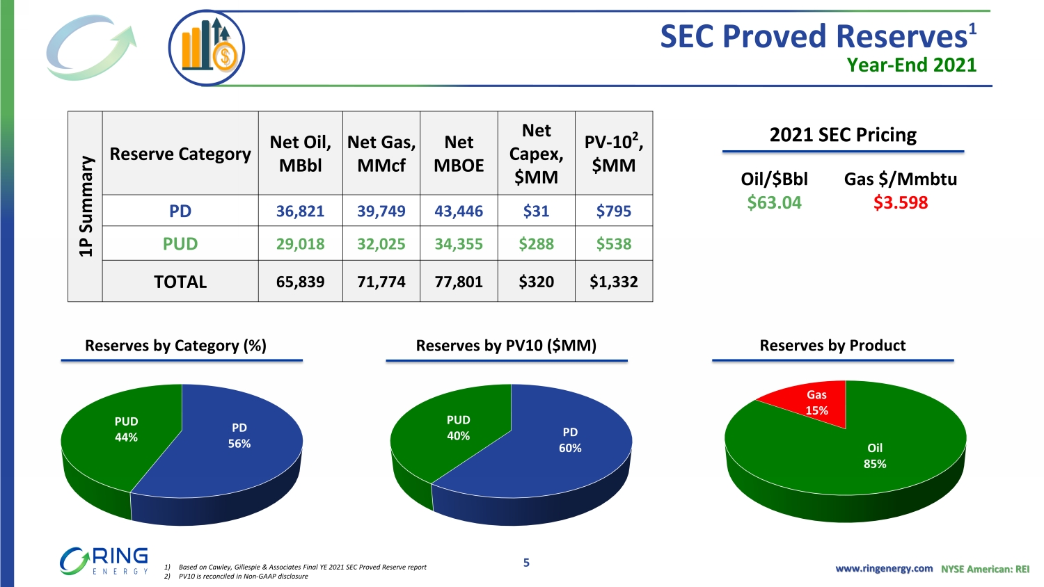 www.ringenergy.com NYSE American: REI Q4 2021 Highlights Executing our Strategy 4 ▪ Grew net sales by 11% compared to Q3 ▪ Adjusted EBITDA grew 21% over Q3 ▪ Paid down debt by $5.0 million utilizing a portion of Free Cash Flow ▪ Completed and placed on production 2 Phase IV wells (1 NWS & 1 CBP) on time and within budget ▪ Delivered net cash provided by operating activities of $23.2 million $9.3 1 MM Free Cash Flow $24.0 1 MM Adjusted EBITDA $24.1 MM Net Income $5.0 MM Debt Repayment 9 ,153 Boe /d (85% oil) Net Sales per day $ 9 .12 2 Lifting cost per Boe 1. Adjusted EBITDA and Free Cash Flow are Non - GAAP financial measures and reconciled in Ring’s earnings releases 2. Lifting cost equals lease operating expenses excluding gathering, transportation and processing costs divided by the total b arr els of oil equivalent (6 Mcf = 1 Boe ) sold during the same period. Q4 2021 Highlights Nearly 60% of the low - priced hedges rolled off December 31, 2021