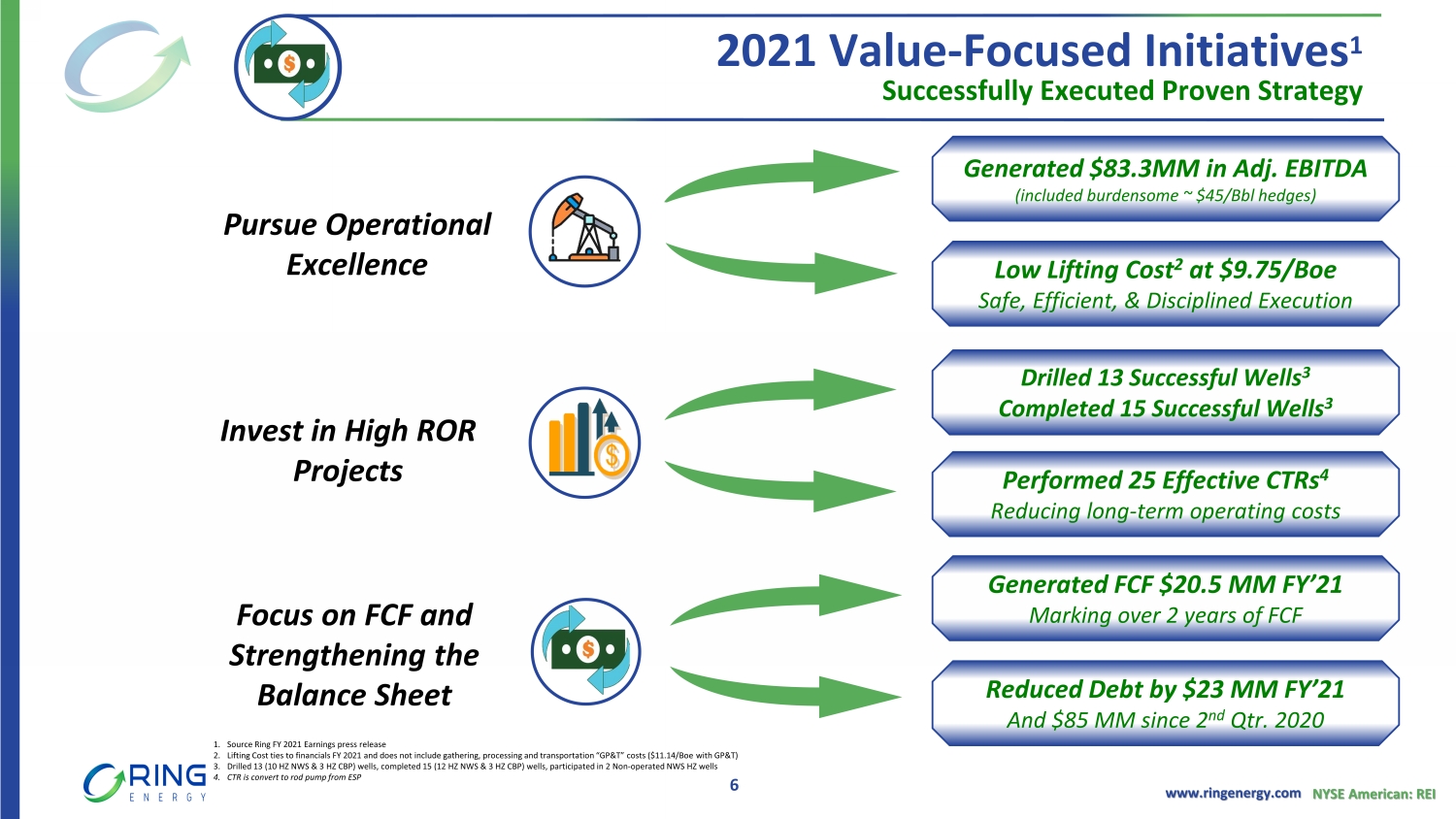 www.ringenergy.com NYSE American: REI Focus on FCF and Strengthening the Balance Sheet Invest in High ROR Projects Performed 25 Effective CTRs 4 Reducing long - term operating costs Low Lifting Cost 2 at $9.75/Boe Safe, Efficient, & Disciplined Execution Generated $83.3MM in Adj. EBITDA (included burdensome ~ $45/ Bbl hedges) Generated FCF $20.5 MM FY’21 Marking over 2 years of FCF Reduced Debt by $23 MM FY’21 And $85 MM since 2 nd Qtr. 2020 6 Drilled 13 Successful Wells 3 Completed 15 Successful Wells 3 Successfully Executed Proven Strategy 2021 Value - Focused Initiatives 1 1. Source Ring FY 2021 Earnings press release 2. Lifting Cost ties to financials FY 2021 and does not include gathering, processing and transportation “GP&T” costs ($11.14/Bo e w ith GP&T) 3. Drilled 13 (10 HZ NWS & 3 HZ CBP) wells, completed 15 (12 HZ NWS & 3 HZ CBP) wells, participated in 2 Non - operated NWS HZ wells 4. CTR is convert to rod pump from ESP Pursue Operational Excellence