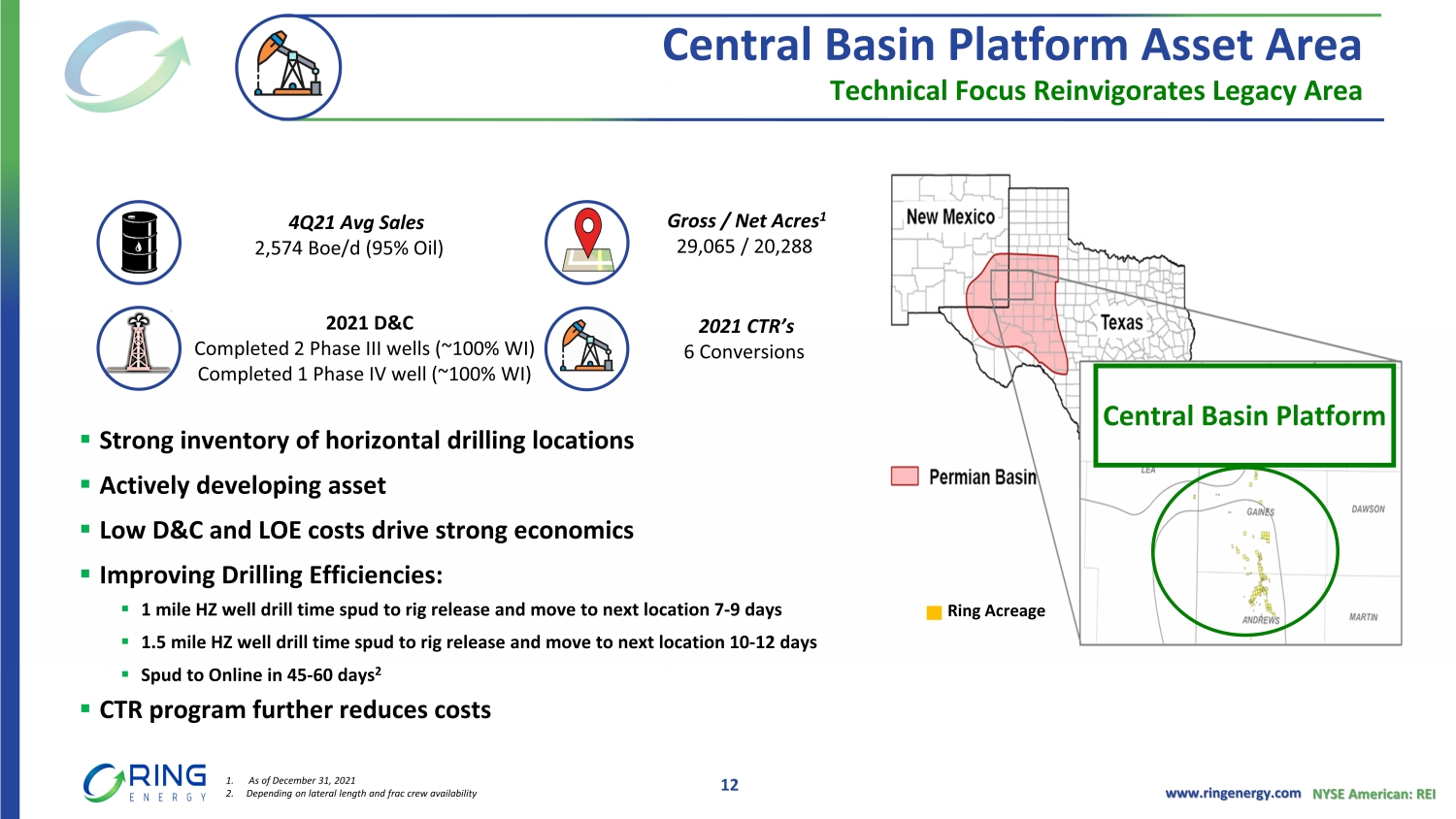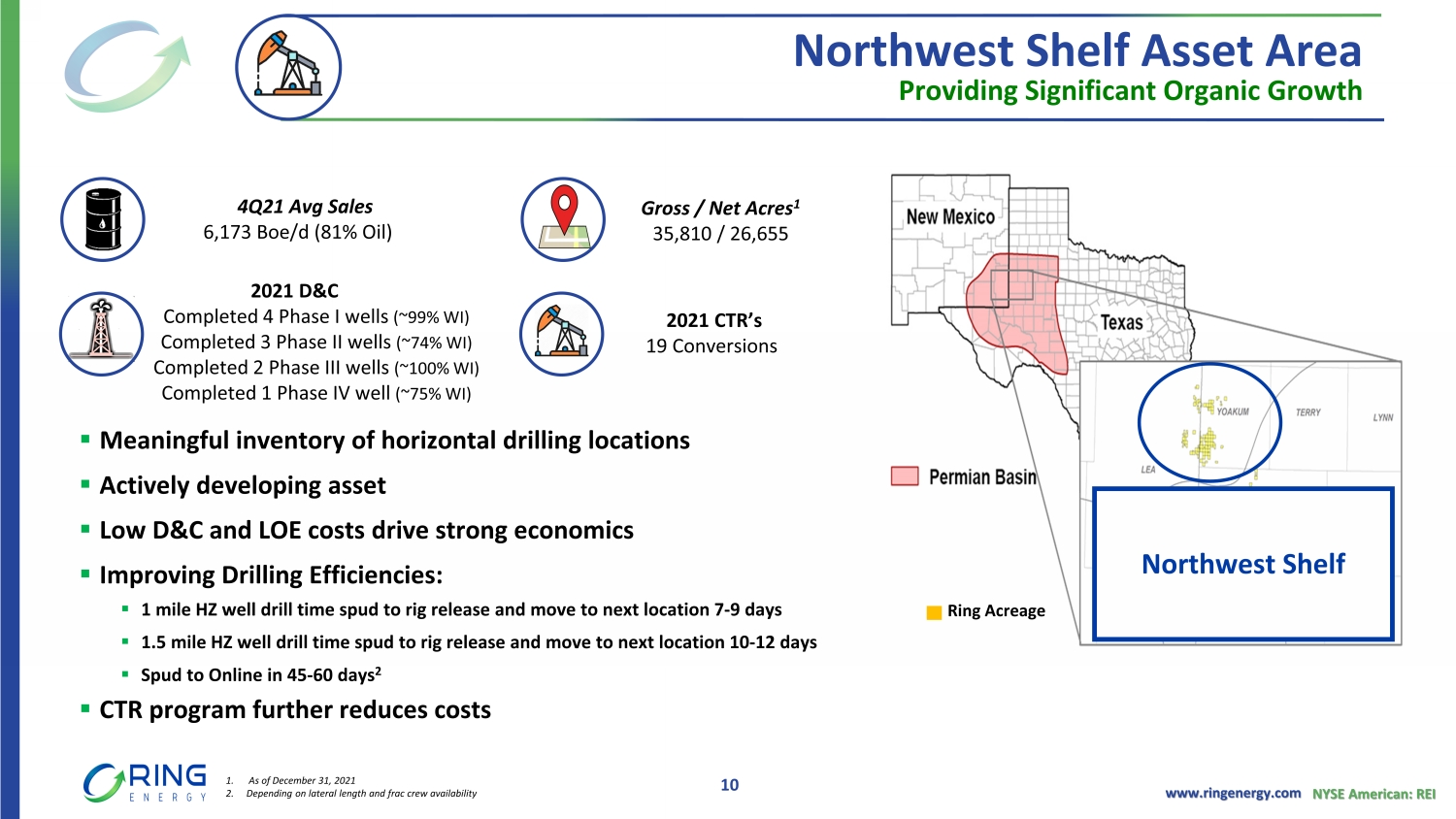 www.ringenergy.com NYSE American: REI ▪ Meaningful inventory of horizontal drilling locations ▪ Actively developing asset ▪ Low D&C and LOE costs drive strong economics ▪ Improving Drilling Efficiencies: ▪ CTR program further reduces costs ▪ 1 mile HZ well drill time spud to rig release and move to next location 7 - 9 days ▪ 1.5 mile HZ well drill time spud to rig release and move to next location 10 - 12 days ▪ Spud to Online in 45 - 60 days 2 Providing Significant Organic Growth 4Q21 Avg Sales 6,173 Boe /d (81% Oil) 2021 D&C Completed 4 Phase I wells (~99% WI) Completed 3 Phase II wells (~74% WI) Completed 2 Phase III wells (~100% WI) Completed 1 Phase IV well (~75% WI) Gross / Net Acres 1 35,810 / 26,655 Northwest Shelf Asset Area 10 2021 CTR’s 19 Conversions 1. As of December 31, 2021 2. Depending on lateral length and frac crew availability Ring Acreage Northwest Shelf