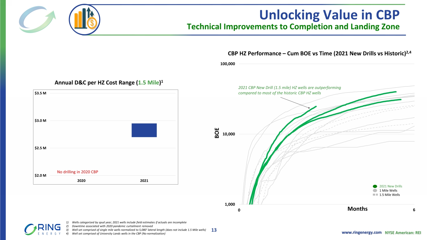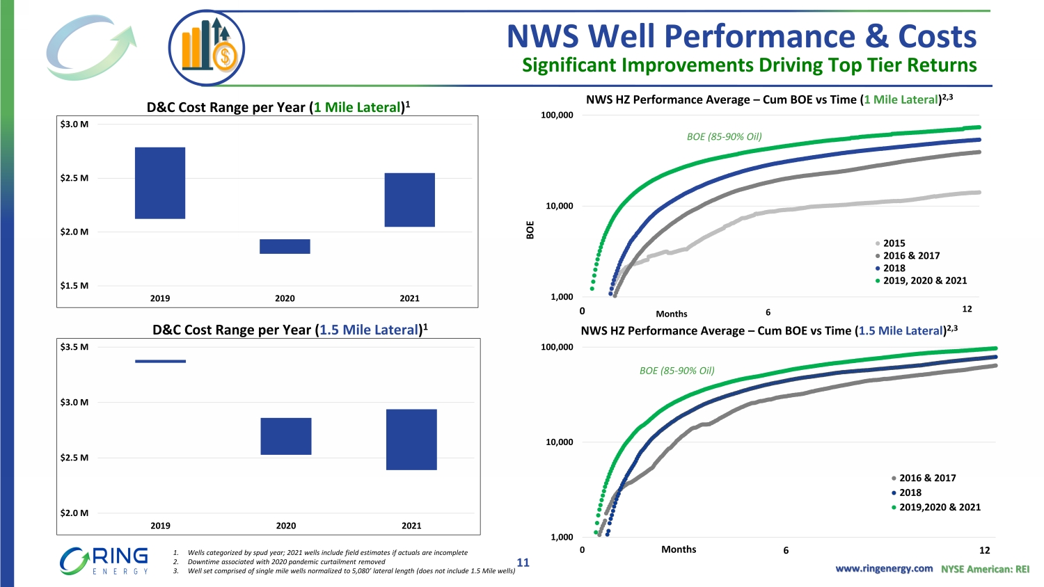 www.ringenergy.com NYSE American: REI 1,000 10,000 100,000 0 180 360 2016 & 2017 2018 2019,2020 & 2021 Months 6 12 BOE (85 - 90% Oil) 1,000 10,000 100,000 0 180 360 2015 2016 & 2017 2018 2019, 2020 & 2021 $2.0 M $2.5 M $3.0 M $3.5 M 2019 2020 2021 NWS Well Performance & Costs Significant Improvements Driving Top Tier Returns 11 D&C Cost Range per Year ( 1 Mile Lateral ) 1 NWS HZ Performance Average – Cum BOE vs Time ( 1 Mile Lateral ) 2,3 1. Wells categorized by spud year; 2021 wells include field estimates if actuals are incomplete 2. Downtime associated with 2020 pandemic curtailment removed 3. Well set comprised of single mile wells normalized to 5,080’ lateral length (does not include 1.5 Mile wells) ~530 Avg ~410 Avg ~420 Avg $1.5 M $2.0 M $2.5 M $3.0 M 2019 2020 2021 D&C Cost Range per Year ( 1.5 Mile Lateral ) 1 BOE (85 - 90% Oil) Months 6 12 BOE NWS HZ Performance Average – Cum BOE vs Time ( 1.5 Mile Lateral ) 2,3