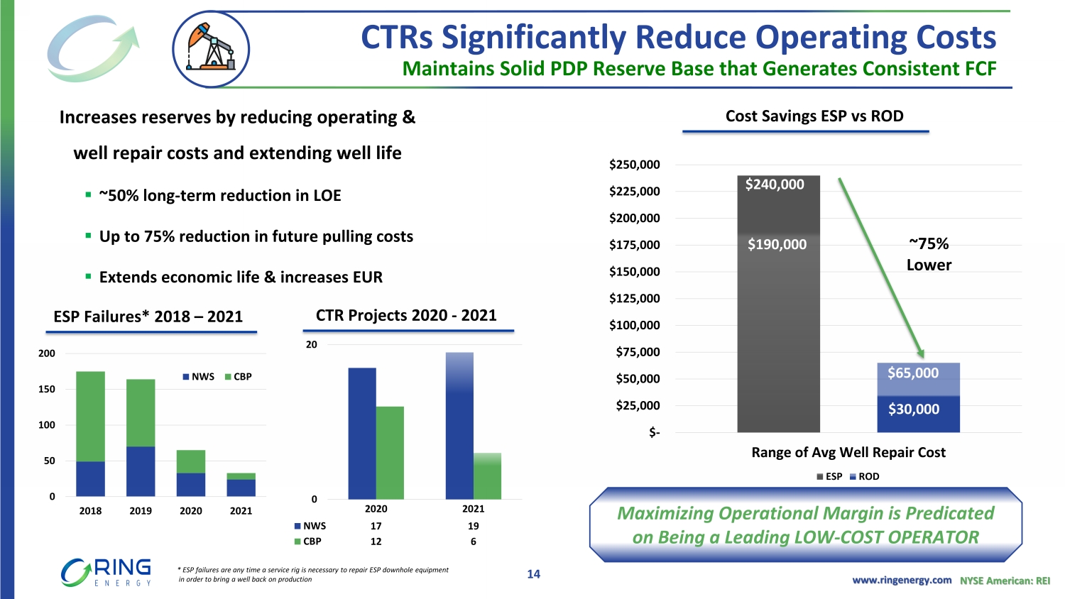 www.ringenergy.com NYSE American: REI 0 50 100 150 200 2018 2019 2020 2021 NWS CBP Maintains Solid PDP Reserve Base that Generates Consistent FCF Increases reserves by reducing operating & well repair costs and extending well life ▪ ~50% long - term reduction in LOE ▪ Up to 75% reduction in future pulling costs ▪ Extends economic life & increases EUR CTRs Significantly Reduce Operating Costs 2020 2021 NWS 17 19 CBP 12 6 0 20 14 $- $25,000 $50,000 $75,000 $100,000 $125,000 $150,000 $175,000 $200,000 $225,000 $250,000 Range of Avg Well Repair Cost ESP ROD $190,000 $65,000 $30,000 Cost Savings ESP vs ROD Maximizing Operational Margin is Predicated on Being a Leading LOW - COST OPERATOR ~75% Lower $240,000 CTR Projects 2020 - 2021 ESP Failures* 2018 – 2021 * ESP failures are any time a service rig is necessary to repair ESP downhole equipment in order to bring a well back on production