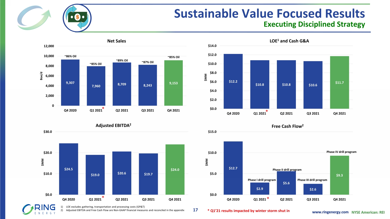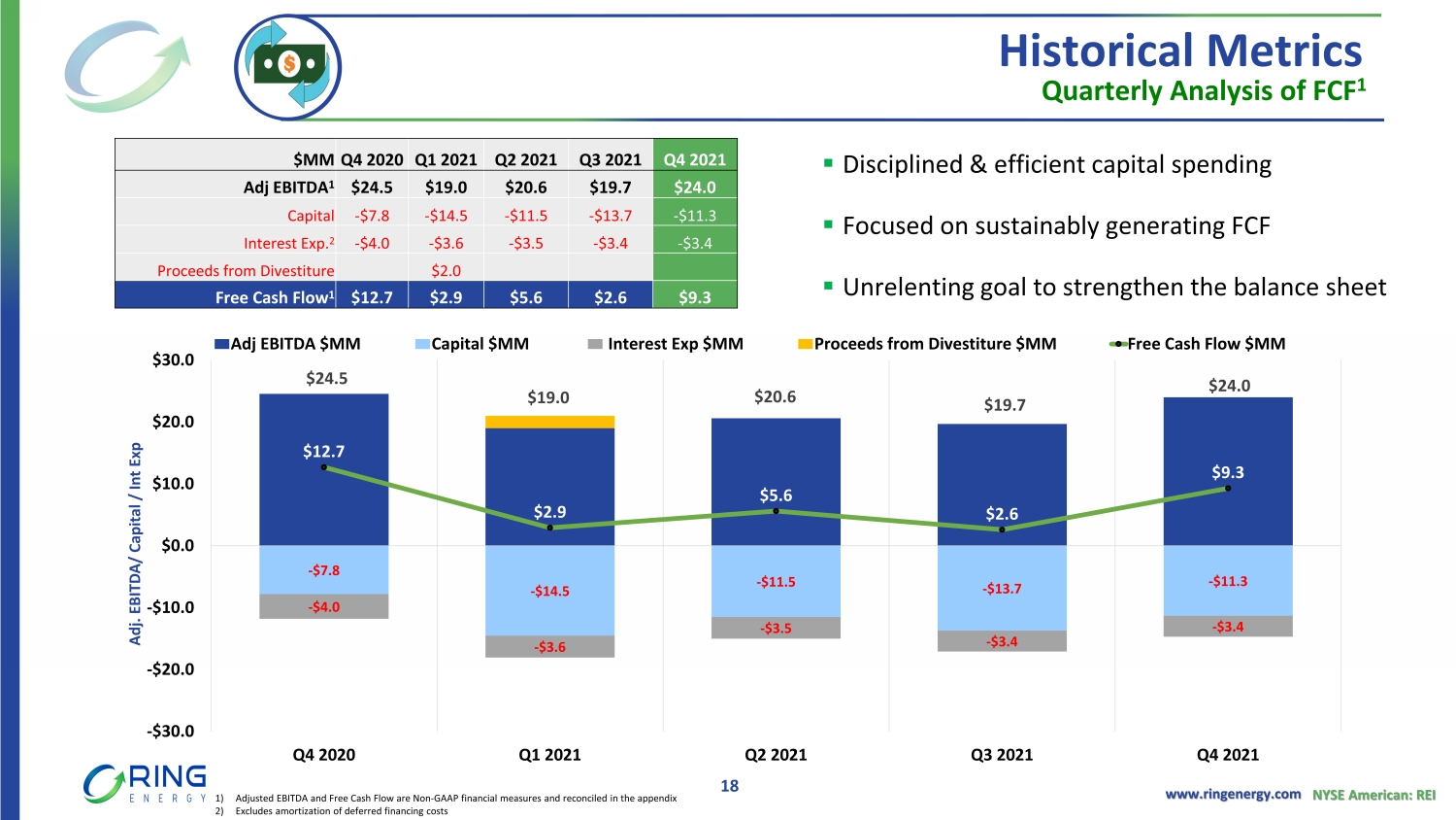 www.ringenergy.com NYSE American: REI Sustainable Value Focused Results 9,307 7,960 8,709 8,243 9,153 0 2,000 4,000 6,000 8,000 10,000 12,000 Q4 2020 Q1 2021 Q2 2021 Q3 2021 Q4 2021 Boe /d Net Sales $12.2 $10.8 $10.8 $10.6 $11.7 $0.0 $2.0 $4.0 $6.0 $8.0 $10.0 $12.0 $14.0 Q4 2020 Q1 2021 Q2 2021 Q3 2021 Q4 2021 $MM LOE 1 and Cash G&A $24.5 $19.0 $20.6 $19.7 $24.0 $0.0 $10.0 $20.0 $30.0 Q4 2020 Q1 2021 Q2 2021 Q3 2021 Q4 2021 $MM Adjusted EBITDA 2 $12.7 $2.9 $5.6 $2.6 $9.3 $0.0 $5.0 $10.0 $15.0 Q4 2020 Q1 2021 Q2 2021 Q3 2021 Q4 2021 $MM Free Cash Flow 2 Executing Disciplined Strategy 17 1) LOE excludes gathering, transportation and processing costs (GP&T) 2) Adjusted EBITDA and Free Cash Flow are Non - GAAP financial measures and reconciled in the appendix * Q1’21 results impacted by winter storm shut in Phase I drill program * * * * Phase II drill program ~87% Oil ~89% Oil ~85% Oil ~86% Oil Phase III drill program ~85% Oil Phase IV drill program