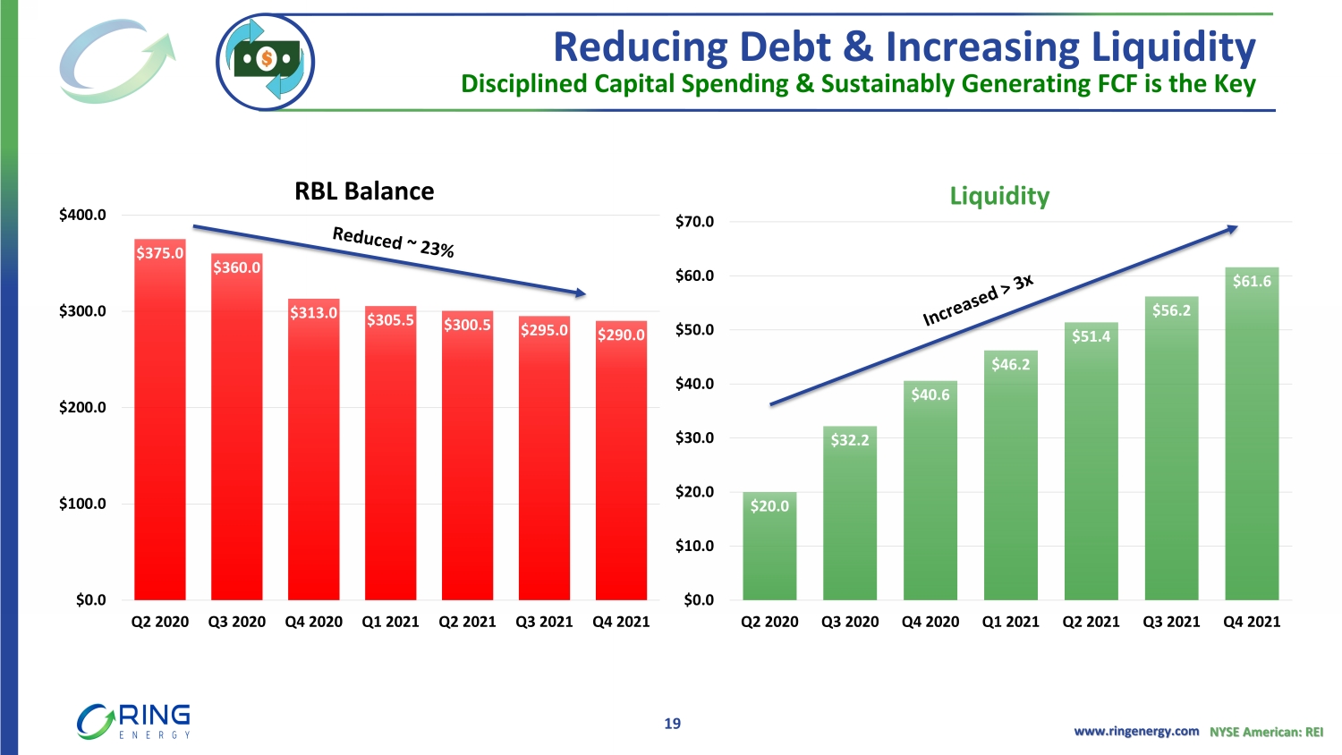 www.ringenergy.com NYSE American: REI Historical Metrics Quarterly Analysis of FCF 1 $MM Q4 2020 Q1 2021 Q2 2021 Q3 2021 Q4 2021 Adj EBITDA 1 $24.5 $19.0 $20.6 $19.7 $24.0 Capital - $7.8 - $14.5 - $11.5 - $13.7 - $11.3 Interest Exp. 2 - $4.0 - $3.6 - $3.5 - $3.4 - $3.4 Proceeds from Divestiture $2.0 Free Cash Flow 1 $12.7 $2.9 $5.6 $2.6 $9.3 18 $24.5 $19.0 $20.6 $19.7 $24.0 - $7.8 - $14.5 - $11.5 - $13.7 - $11.3 - $4.0 - $3.6 - $3.5 - $3.4 - $3.4 $12.7 $2.9 $5.6 $2.6 $9.3 -$30.0 -$20.0 -$10.0 $0.0 $10.0 $20.0 $30.0 Q4 2020 Q1 2021 Q2 2021 Q3 2021 Q4 2021 Adj. EBITDA/ Capital / Int Exp Adj EBITDA $MM Capital $MM Interest Exp $MM Proceeds from Divestiture $MM Free Cash Flow $MM ▪ Disciplined & efficient capital spending ▪ Focused on sustainably generating FCF ▪ Unrelenting goal to strengthen the balance sheet 1) Adjusted EBITDA and Free Cash Flow are Non - GAAP financial measures and reconciled in the appendix 2) Excludes amortization of deferred financing costs