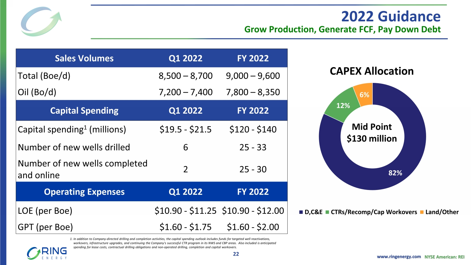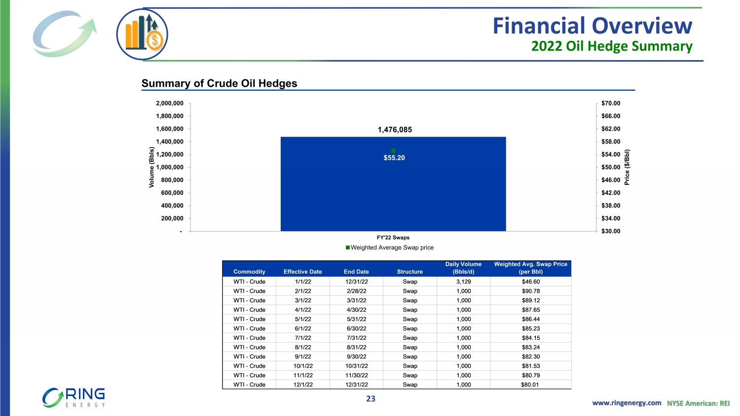 www.ringenergy.com NYSE American: REI Financial Overview 2022 Oil Hedge Summary Summary of Crude Oil Hedges 1,476,085 $55.20 $30.00 $34.00 $38.00 $42.00 $46.00 $50.00 $54.00 $58.00 $62.00 $66.00 $70.00 - 200,000 400,000 600,000 800,000 1,000,000 1,200,000 1,400,000 1,600,000 1,800,000 2,000,000 FY'22 Swaps Price ($/Bbl) Volume (Bbls) Weighted Average Swap price Commodity Effective Date End Date Structure Daily Volume (Bbls/d) Weighted Avg. Swap Price (per Bbl) WTI - Crude 1/1/22 12/31/22 Swap 3,129 $46.60 WTI - Crude 2/1/22 2/28/22 Swap 1,000 $90.78 WTI - Crude 3/1/22 3/31/22 Swap 1,000 $89.12 WTI - Crude 4/1/22 4/30/22 Swap 1,000 $87.65 WTI - Crude 5/1/22 5/31/22 Swap 1,000 $86.44 WTI - Crude 6/1/22 6/30/22 Swap 1,000 $85.23 WTI - Crude 7/1/22 7/31/22 Swap 1,000 $84.15 WTI - Crude 8/1/22 8/31/22 Swap 1,000 $83.24 WTI - Crude 9/1/22 9/30/22 Swap 1,000 $82.30 WTI - Crude 10/1/22 10/31/22 Swap 1,000 $81.53 WTI - Crude 11/1/22 11/30/22 Swap 1,000 $80.79 WTI - Crude 12/1/22 12/31/22 Swap 1,000 $80.01 23