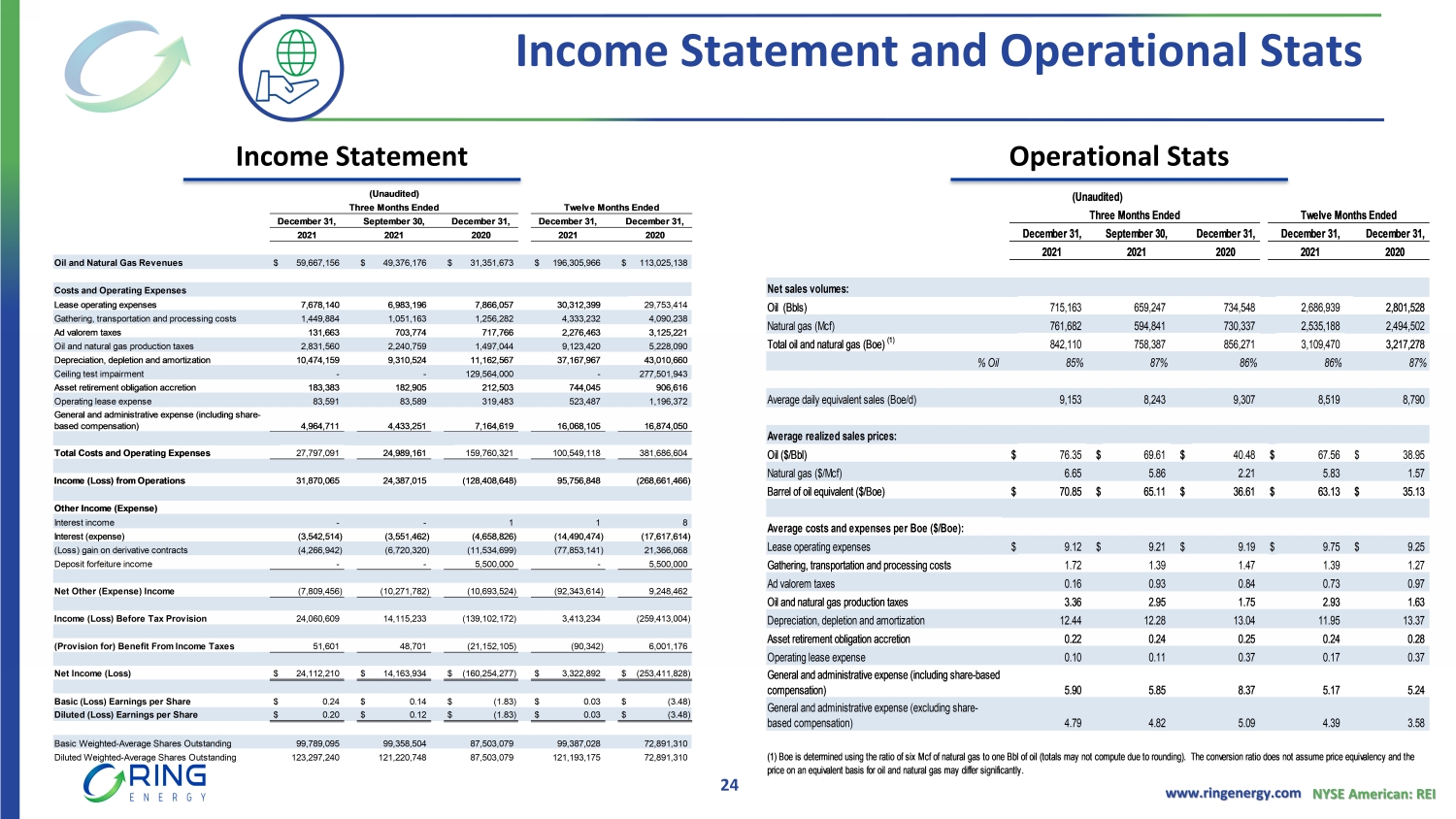 www.ringenergy.com NYSE American: REI Income Statement and Operational Stats Income Statement Operational Stats 24 Oil and Natural Gas Revenues $ 59,667,156 $ 49,376,176 $ 31,351,673 $ 196,305,966 $ 113,025,138 Costs and Operating Expenses Lease operating expenses 7,678,140 6,983,196 7,866,057 30,312,399 29,753,414 Gathering, transportation and processing costs 1,449,884 1,051,163 1,256,282 4,333,232 4,090,238 Ad valorem taxes 131,663 703,774 717,766 2,276,463 3,125,221 Oil and natural gas production taxes 2,831,560 2,240,759 1,497,044 9,123,420 5,228,090 Depreciation, depletion and amortization 10,474,159 9,310,524 11,162,567 37,167,967 43,010,660 Ceiling test impairment - - 129,564,000 - 277,501,943 Asset retirement obligation accretion 183,383 182,905 212,503 744,045 906,616 Operating lease expense 83,591 83,589 319,483 523,487 1,196,372 General and administrative expense (including share- based compensation) 4,964,711 4,433,251 7,164,619 16,068,105 16,874,050 Total Costs and Operating Expenses 27,797,091 24,989,161 159,760,321 100,549,118 381,686,604 Income (Loss) from Operations 31,870,065 24,387,015 (128,408,648) 95,756,848 (268,661,466) Other Income (Expense) Interest income - - 1 1 8 Interest (expense) (3,542,514) (3,551,462) (4,658,826) (14,490,474) (17,617,614) (Loss) gain on derivative contracts (4,266,942) (6,720,320) (11,534,699) (77,853,141) 21,366,068 Deposit forfeiture income - - 5,500,000 - 5,500,000 Net Other (Expense) Income (7,809,456) (10,271,782) (10,693,524) (92,343,614) 9,248,462 Income (Loss) Before Tax Provision 24,060,609 14,115,233 (139,102,172) 3,413,234 (259,413,004) (Provision for) Benefit From Income Taxes 51,601 48,701 (21,152,105) (90,342) 6,001,176 Net Income (Loss) $ 24,112,210 $ 14,163,934 $ (160,254,277) $ 3,322,892 $ (253,411,828) Basic (Loss) Earnings per Share $ 0.24 $ 0.14 $ (1.83) $ 0.03 $ (3.48) Diluted (Loss) Earnings per Share $ 0.20 $ 0.12 $ (1.83) $ 0.03 $ (3.48) Basic Weighted-Average Shares Outstanding 99,789,095 99,358,504 87,503,079 99,387,028 72,891,310 Diluted Weighted-Average Shares Outstanding 123,297,240 121,220,748 87,503,079 121,193,175 72,891,310 Three Months Ended (Unaudited) Twelve Months Ended December 31, December 31,December 31, September 30, December 31, 2021 2021 2020 2021 2020