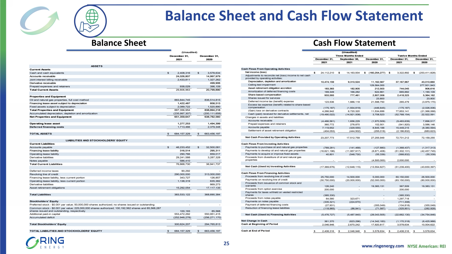 www.ringenergy.com NYSE American: REI Balance Sheet and Cash Flow Statement Balance Sheet Cash Flow Statement 25 ASSETS Current Assets Cash and cash equivalents $ 2,408,316 $ 3,578,634 Accounts receivable 24,026,807 14,997,979 Joint interest billing receivable 2,433,811 1,327,262 Derivative receivable - 499,906 Prepaid expenses and retainers 938,029 396,109 Total Current Assets 29,806,963 20,799,890 Properties and Equipment Oil and natural gas properties, full cost method 883,844,745 836,514,815 Financing lease asset subject to depreciation 1,422,487 858,513 Fixed assets subject to depreciation 2,089,722 1,520,890 Total Properties and Equipment 887,356,954 838,894,218 Accumulated depreciation, depletion and amortization (235,997,307) (200,111,658) Net Properties and Equipment 651,359,647 638,782,560 Operating lease asset 1,277,253 1,494,399 Deferred financing costs 1,713,466 2,379,348 TOTAL ASSETS $ 684,157,329 $ 663,456,197 LIABILITIES AND STOCKHOLDERS' EQUITY Current Liabilities Accounts payable $ 46,233,452 $ 32,500,081 Financing lease liability 316,514 295,311 Operating lease liability 290,766 859,017 Derivative liabilities 29,241,588 3,287,328 Notes payable 586,410 - Total Current Liabilities 76,668,730 36,941,737 Deferred income taxes 90,292 - Revolving line of credit 290,000,000 313,000,000 Financing lease liability, less current portion 343,727 126,857 Operating lease liability, less current portion 1,138,319 635,382 Derivative liabilities - 869,273 Asset retirement obligations 15,292,054 17,117,135 Total Liabilities 383,533,122 368,690,384 Stockholders' Equity Preferred stock - $0.001 par value; 50,000,000 shares authorized; no shares issued or outstanding - - Common stock - $0.001 par value; 225,000,000 shares authorized; 100,192,562 shares and 85,568,287 shares issued and outstanding, respectively 100,193 85,568 Additional paid-in capital 553,472,292 550,951,415 Accumulated deficit (252,948,278) (256,271,170) Total Stockholders' Equity 300,624,207 294,765,813 TOTAL LIABILITIES AND STOCKHOLDERS' EQUITY $ 684,157,329 $ 663,456,197 December 31, December 31, 2021 2020