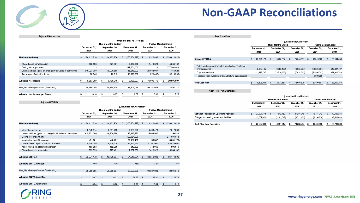 www.ringenergy.com NYSE American: REI Non - GAAP Reconciliations 27 Net Income (Loss) $ 24,112,210 $ 14,163,934 $ (160,254,277) $ 3,322,892 $ (253,411,828) Share-based compensation 933,593 777,461 2,807,006 2,418,323 5,364,162 Ceiling test impairment - - 129,564,000 - 277,501,943 Unrealized loss (gain) on change in fair value of derivatives (15,223,080) (8,200,688) 15,243,222 25,084,987 1,156,523 Tax impact of adjusted items 30,646 25,612 19,126,056 (225,432) (9,915,293) Adjusted Net Income $ 9,853,369 $ 6,766,319 $ 6,486,007 $ 30,600,770 $ 20,695,507 Weighted-Average Shares Outstanding 99,789,095 99,358,504 87,503,079 99,387,028 72,891,310 Adjusted Net Income per Share $ 0.10 $ 0.07 $ 0.07 $ 0.31 $ 0.28 Net Income (Loss) $ 24,112,210 $ 14,163,934 $ (160,254,277) $ 3,322,892 $ (253,411,828) Interest expense, net 3,542,514 3,551,462 4,658,825 14,490,473 17,617,606 Unrealized loss (gain) on change in fair value of derivatives (15,223,080) (8,200,688) 15,243,222 25,084,987 1,156,523 Ceiling test impairment - - 129,564,000 - 277,501,943 Income tax (benefit) expense (51,601) (48,701) 21,152,105 90,342 (6,001,176) Depreciation, depletion and amortization 10,474,159 9,310,524 11,162,567 37,167,967 43,010,660 Asset retirement obligation accretion 183,383 182,905 212,503 744,045 906,616 Share-based compensation 933,593 777,461 2,807,006 2,418,323 5,364,162 Adjusted EBITDA $ 23,971,178 $ 19,736,897 $ 24,545,951 $ 83,319,029 $ 86,144,506 Adjusted EBITDA Margin 40% 40% 78% 42% 76% Weighted-Average Shares Outstanding 99,789,095 99,358,504 87,503,079 99,387,028 72,891,310 Adjusted EBITDA per Boe $ 28.47 $ 26.02 $ 28.67 $ 26.80 $ 26.78 Adjusted EBITDA per Share $ 0.24 $ 0.20 $ 0.28 $ 0.84 $ 1.18 December 31, December 31, Twelve Months Ended Adjusted Net Income Adjusted EBITDA 2021 December 31, December 31, December 31, 2021 2020 Twelve Months Ended (Unaudited for All Periods) Three Months Ended December 31, 20202021 2021 2020 September 30, Three Months Ended September 30, December 31,December 31, 2021 (Unaudited for All Periods) 2021 2020