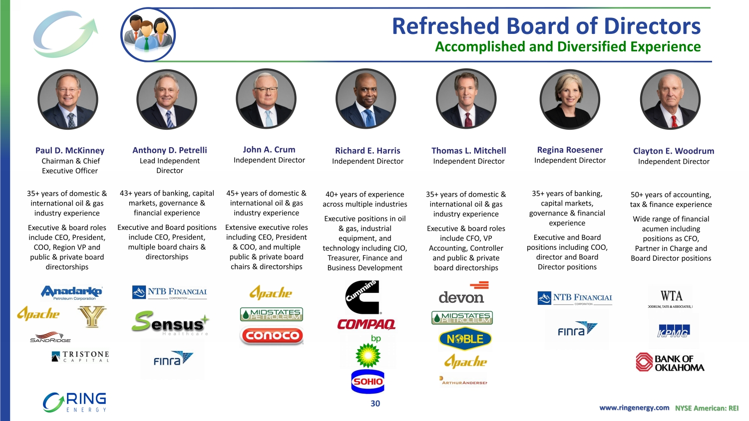 www.ringenergy.com NYSE American: REI Add Photo Add Photo Add Photo Add Photo Add Photo Paul D. McKinney Chairman & Chief Executive Officer 35+ years of domestic & international oil & gas industry experience Executive & board roles include CEO, President, COO, Region VP and public & private board directorships Travis Thomas EVP & Chief Financial Officer 17+ years of oil & gas industry experience & accounting experience High level financial experience including CAO, VP Finance, Controller, Treasurer Alexander Dyes EVP of Engineering & Corporate Strategy 15+ years of oil & gas industry experience Multi - disciplined experience including VP A&D, VP Engineering, Director Strategy, multiple engineering & operational roles Marinos Baghdati EVP of Operations 19+ years of oil & gas industry experience Operational experience in drilling, completions and production including VP Operations, Operations manager, multiple engineering roles Stephen D. Brooks EVP of Land, Legal, HR & Marketing 40+ years of oil & gas industry experience Extensive career as landman including VP Land & Legal, VP HR VP Land and Land Manager Hollie Lamb VP of Compliance & GM of Midland Office 20+ years of oil & gas industry experience Previously Partner of HeLMS Oil & Gas, VP Engineering, Reservoir & Geologic Engineer Experienced Management Team Shared Vision with a Track Record of Success 29