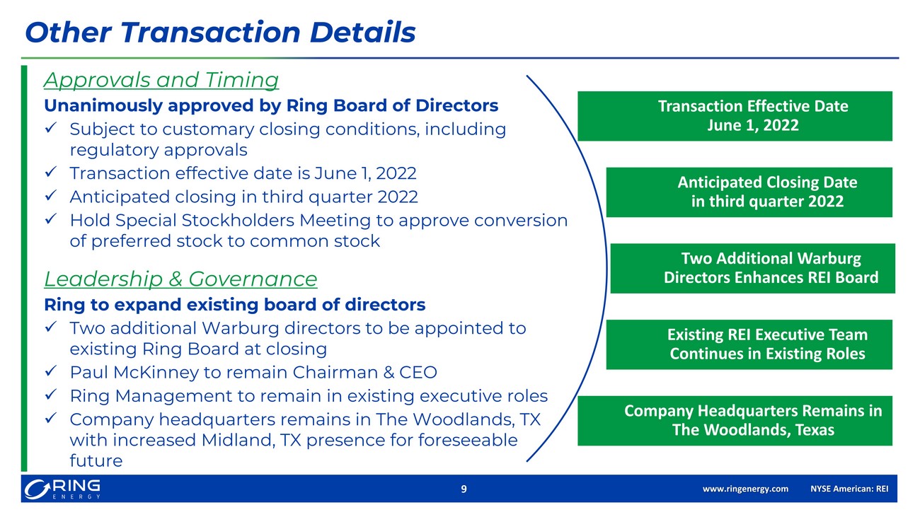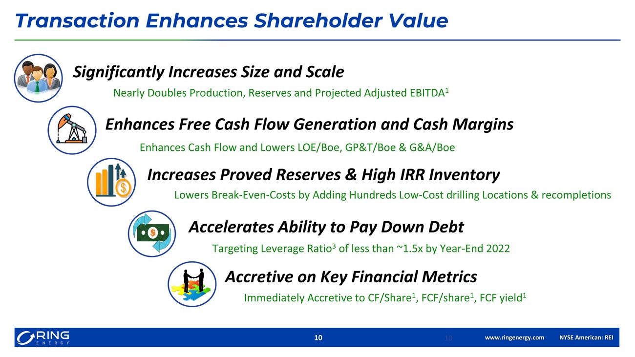 www.ringenergy.com NYSE American: REI 9 Approvals and Timing Unanimously approved by Ring Board of Directors x Subject to customary closing conditions, including regulatory approvals x Transaction effective date is June 1, 2022 x Anticipated closing in third quarter 2022 x Hold Special Stockholders Meeting to approve conversion of preferred stock to common stock Leadership & Governance Ring to expand existing board of directors x Two additional Warburg directors to be appointed to existing Ring Board at closing x Paul McKinney to remain Chairman & CEO x Ring Management to remain in existing executive roles x Company headquarters remains in The Woodlands, TX with increased Midland, TX presence for foreseeable future Other Transaction Details Transaction Effective Date June 1, 2022 Anticipated Closing Date in third quarter 2022 Two Additional Warburg Directors Enhances REI Board Existing REI Executive Team Continues in Existing Roles Company Headquarters Remains in The Woodlands, Texas