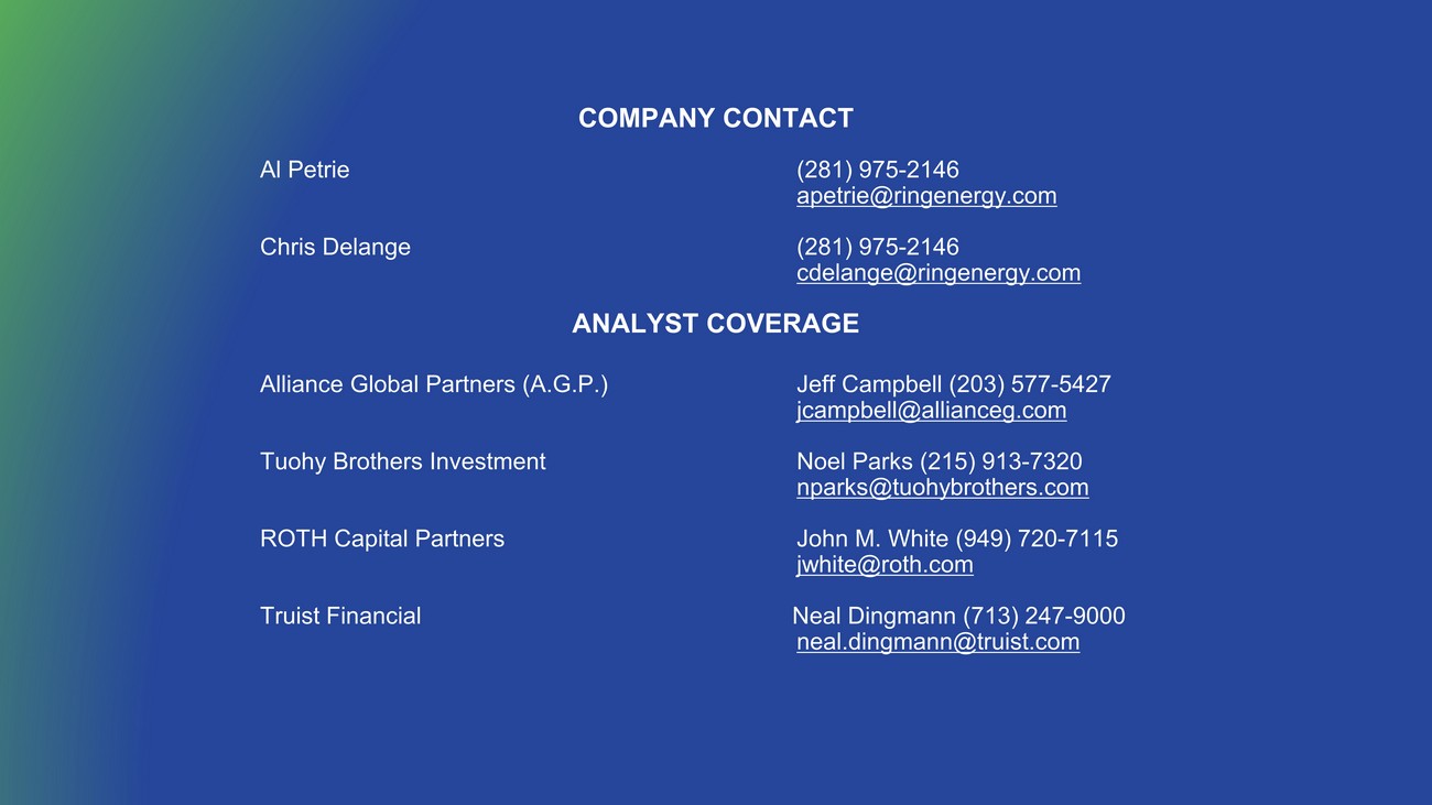ANALYST COVERAGE Alliance Global Partners (A.G.P.) Jeff Campbell (203) 577 - 5427 jcampbell@allianceg.com Tuohy Brothers Investment Noel Parks (215) 913 - 7320 nparks@tuohybrothers.com ROTH Capital Partners John M. White (949) 720 - 7115 jwhite@roth.com Truist Financial Neal Dingmann (713) 247 - 9000 neal.dingmann@truist.com COMPANY CONTACT Al Petrie (281) 975 - 2146 apetrie@ringenergy.com Chris Delange (281) 975 - 2146 cdelange @ringenergy.com