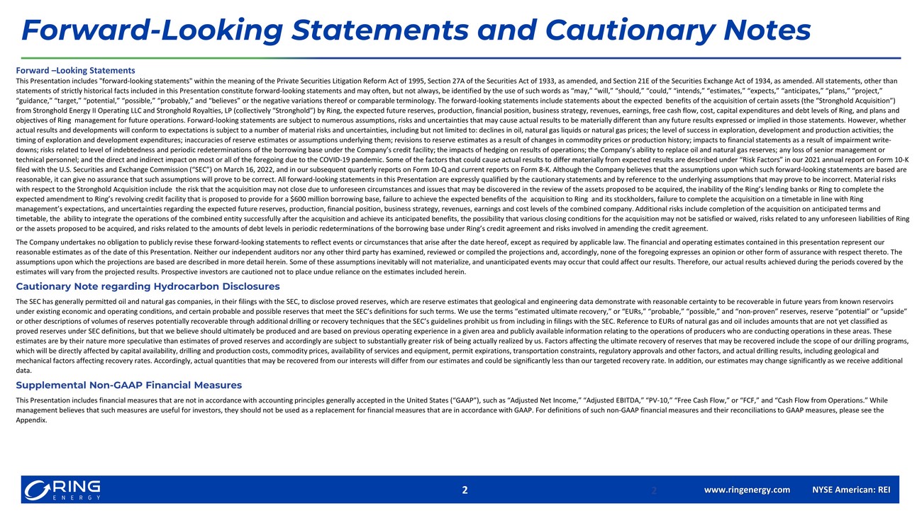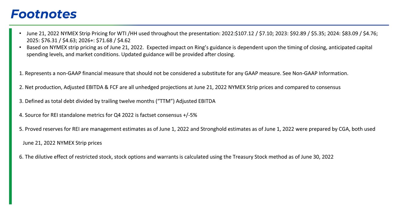 • June 21, 2022 NYMEX Strip Pricing for WTI /HH used throughout the presentation: 2022:$107.12 / $7.10; 2023: $92.89 / $5.35; 2 024 : $83.09 / $4.76; 2025: $76.31 / $4.63; 2026+: $71.68 / $4.62 • Based on NYMEX strip pricing as of June 21, 2022. Expected impact on Ring’s guidance is dependent upon the timing of closing, anti cip ated capital spending levels, and market conditions. Updated guidance will be provided after closing. 1. Represents a non - GAAP financial measure that should not be considered a substitute for any GAAP measure. See Non - GAAP Informati on. 2. Net production, Adjusted EBITDA & FCF are all unhedged projections at June 21, 2022 NYMEX Strip prices and compared to consen su s 3. Defined as total debt divided by trailing twelve months (“TTM”) Adjusted EBITDA 4. Source for REI standalone metrics for Q4 2022 is factset consensus +/ - 5% 5. Proved reserves for REI are management estimates as of June 1, 2022 and Stronghold estimates as of June 1, 2022 were prepared b y CGA, both used June 21, 2022 NYMEX Strip prices 6. The dilutive effect of restricted stock, stock options and warrants is calculated using the Treasury Stock method as of June 30 , 2022 Footnotes