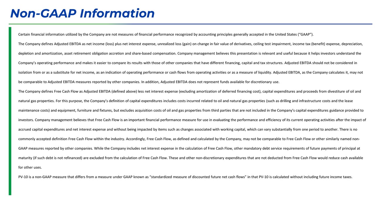 Certain financial information utilized by the Company are not measures of financial performance recognized by accounting prin cip les generally accepted in the United States (“GAAP”). The Company defines Adjusted EBITDA as net income (loss) plus net interest expense, unrealized loss (gain) on change in fair val ue of derivatives, ceiling test impairment, income tax (benefit) expense, depreciation, depletion and amortization, asset retirement obligation accretion and share - based compensation. Company management believes this presentation is relevant and useful because it helps investors understand the Company’s operating performance and makes it easier to compare its results with those of other companies that have different fin ancing, capital and tax structures. Adjusted EBITDA should not be considered in isolation from or as a substitute for net income, as an indication of operating performance or cash flows from operating acti vit ies or as a measure of liquidity. Adjusted EBITDA, as the Company calculates it, may not be comparable to Adjusted EBITDA measures reported by other companies. In addition, Adjusted EBITDA does not represent funds ava ilable for discretionary use. The Company defines Free Cash Flow as Adjusted EBITDA (defined above) less net interest expense (excluding amortization of de fer red financing cost), capital expenditures and proceeds from divestiture of oil and natural gas properties. For this purpose, the Company’s definition of capital expenditures includes costs incurred related to oi l and natural gas properties (such as drilling and infrastructure costs and the lease maintenance costs) and equipment, furniture and fixtures, but excludes acquisition costs of oil and gas properties from third pa rties that are not included in the Company’s capital expenditures guidance provided to investors. Company management believes that Free Cash Flow is an important financial performance measure for use in evaluatin g t he performance and efficiency of its current operating activities after the impact of accrued capital expenditures and net interest expense and without being impacted by items such as changes associated with wor kin g capital, which can vary substantially from one period to another. There is no commonly accepted definition Free Cash Flow within the industry. Accordingly, Free Cash Flow, as defined and calculated by th e C ompany, may not be comparable to Free Cash Flow or other similarly named non - GAAP measures reported by other companies. While the Company includes net interest expense in the calculation of Free Cash Fl ow, other mandatory debt service requirements of future payments of principal at maturity (if such debt is not refinanced) are excluded from the calculation of Free Cash Flow. These and other non - discretionary expenditures that are not deducted from Free Cash Flow would reduce cash available for other uses. PV - 10 is a non - GAAP measure that differs from a measure under GAAP known as “standardized measure of discounted future net cash flows” in that PV - 10 is calculated without including future income taxes. Non - GAAP Information