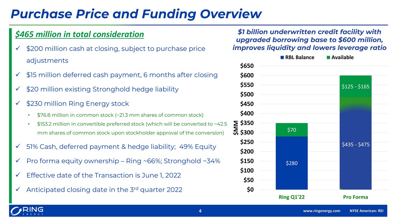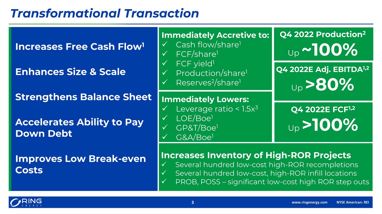 www.ringenergy.com NYSE American: REI 2 Forward - Looking Statements and Cautionary Notes 2 Forward – Looking Statements This Presentation includes "forward - looking statements" within the meaning of the Private Securities Litigation Reform Act of 19 95, Section 27A of the Securities Act of 1933, as amended, and Section 21E of the Securities Exchange Act of 1934, as amended . A ll statements, other than statements of strictly historical facts included in this Presentation constitute forward - looking statements and may often, but n ot always, be identified by the use of such words as “may,” “will,” “should,” “could,” “intends,” “estimates,” “expects,” “an tic ipates,” “plans,” “project,” “guidance,” “target,” “potential,” “possible,” “probably,” and “believes” or the negative variations thereof or comparable te rmi nology. The forward - looking statements include statements about the expected benefits of the acquisition of certain assets (the “Stronghold Acquisition”) from Stronghold Energy II Operating LLC and Stronghold Royalties, LP (collectively “Stronghold”) by Ring, the expected future re serves, production, financial position, business strategy, revenues, earnings, free cash flow, cost, capital expenditures and de bt levels of Ring, and plans and objectives of Ring management for future operations. Forward - looking statements are subject to numerous assumptions, risks and uncertainties that may cause actual results to be materially different than any future results expressed or implied in those sta tements. However, whether actual results and developments will conform to expectations is subject to a number of material risks and uncertainties, incl udi ng but not limited to: declines in oil, natural gas liquids or natural gas prices; the level of success in exploration, devel opm ent and production activities; the timing of exploration and development expenditures; inaccuracies of reserve estimates or assumptions underlying them; revisio ns to reserve estimates as a result of changes in commodity prices or production history; impacts to financial statements as a r esu lt of impairment write - downs; risks related to level of indebtedness and periodic redeterminations of the borrowing base under the Company’s credit fac ility; the impacts of hedging on results of operations; the Company’s ability to replace oil and natural gas reserves; any lo ss of senior management or technical personnel; and the direct and indirect impact on most or all of the foregoing due to the COVID - 19 pandemic. Some of th e factors that could cause actual results to differ materially from expected results are described under “Risk Factors” in ou r 2 021 annual report on Form 10 - K filed with the U.S. Securities and Exchange Commission (“SEC”) on March 16, 2022, and in our subsequent quarterly reports on For m 10 - Q and current reports on Form 8 - K. Although the Company believes that the assumptions upon which such forward - looking state ments are based are reasonable, it can give no assurance that such assumptions will prove to be correct. All forward - looking statements in this Pres entation are expressly qualified by the cautionary statements and by reference to the underlying assumptions that may prove t o b e incorrect. Material risks with respect to the Stronghold Acquisition include the risk that the acquisition may not close due to unforeseen circumstanc es and issues that may be discovered in the review of the assets proposed to be acquired, the inability of the Ring’s lending ba nks or Ring to complete the expected amendment to Ring’s revolving credit facility that is proposed to provide for a $600 million borrowing base, failure to achieve the expected benefits of the acquisition to Ring and its stockholders, failure to complete the acquisition on a tim et able in line with Ring management’s expectations, and uncertainties regarding the expected future reserves, production, financial position, business st rategy, revenues, earnings and cost levels of the combined company. Additional risks include completion of the acquisition on an ticipated terms and timetable, the ability to integrate the operations of the combined entity successfully after the acquisition and achieve its an ticipated benefits, the possibility that various closing conditions for the acquisition may not be satisfied or waived, risks re lated to any unforeseen liabilities of Ring or the assets proposed to be acquired, and risks related to the amounts of debt levels in periodic redeterminations of the bo rro wing base under Ring’s credit agreement and risks involved in amending the credit agreement. The Company undertakes no obligation to publicly revise these forward - looking statements to reflect events or circumstances that arise after the date hereof, except as required by applicable law. The financial and operating estimates contained in this pr es entation represent our reasonable estimates as of the date of this Presentation. Neither our independent auditors nor any other third party has exam ine d, reviewed or compiled the projections and, accordingly, none of the foregoing expresses an opinion or other form of assuran ce with respect thereto. The assumptions upon which the projections are based are described in more detail herein. Some of these assumptions inevitably wi ll not materialize, and unanticipated events may occur that could affect our results. Therefore, our actual results achieved dur ing the periods covered by the estimates will vary from the projected results. Prospective investors are cautioned not to place undue reliance on the estima tes included herein. Cautionary Note regarding Hydrocarbon Disclosures The SEC has generally permitted oil and natural gas companies, in their filings with the SEC, to disclose proved reserves, wh ich are reserve estimates that geological and engineering data demonstrate with