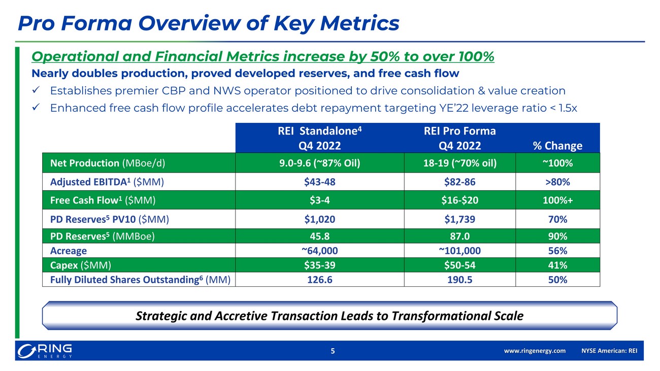www.ringenergy.com NYSE American: REI 4 Purchase Price and Funding Overview $1 billion underwritten credit facility with upgraded borrowing base to $600 million, improves liquidity and lowers leverage ratio $280 $435 - $475 $70 $125 - $165 $0 $50 $100 $150 $200 $250 $300 $350 $400 $450 $500 $550 $600 $650 Ring Q1'22 Pro Forma $MM RBL Balance Available $465 million in total consideration x $200 million cash at closing, subject to purchase price adjustments x $15 million deferred cash payment, 6 months after closing x $20 million existing Stronghold hedge liability x $230 million Ring Energy stock x 51% Cash, deferred payment & hedge liability; 49% Equity x Pro forma equity ownership – Ring ~66%; Stronghold ~34% x Effective date of the Transaction is June 1, 2022 x Anticipated closing date in the 3 rd quarter 2022 • $76.8 million in common stock (~21.3 mm shares of common stock) • $153.2 million in convertible preferred stock (which will be converted to ~42.5 mm shares of common stock upon stockholder approval of the conversion)
