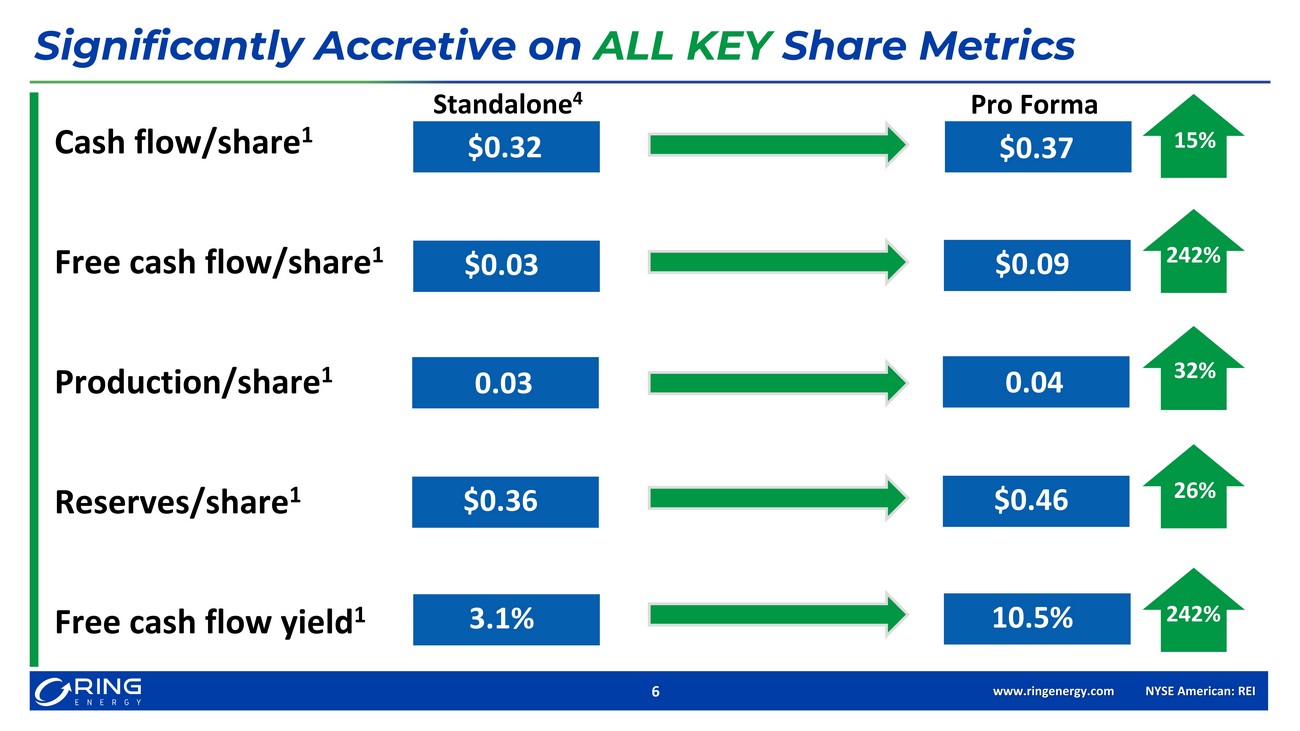 www.ringenergy.com NYSE American: REI 5 Operational and Financial Metrics increase by 50% to over 100% Nearly doubles production, proved developed reserves, and free cash flow x Establishes premier CBP and NWS operator positioned to drive consolidation & value creation x Enhanced free cash flow profile accelerates debt repayment targeting YE’22 leverage ratio < 1.5x Pro Forma Overview of Key Metrics Strategic and Accretive Transaction Leads to Transformational Scale REI Standalone 4 Q4 2022 REI Pro Forma Q4 2022 % Change Net Production ( MBoe /d) 9.0 - 9.6 (~87% Oil) 18 - 19 (~70% oil) ~100% Adjusted EBITDA 1 ($MM) $43 - 48 $82 - 86 >80% Free Cash Flow 1 ($MM) $3 - 4 $16 - $20 100%+ PD Reserves 5 PV10 ($MM) $1,020 $1,739 70% PD Reserves 5 ( MMBoe ) 45.8 87.0 90% Acreage ~64,000 ~101,000 56% Capex ($MM) $35 - 39 $50 - 54 41% Fully Diluted Shares Outstanding 6 (MM) 126.6 190.5 50%