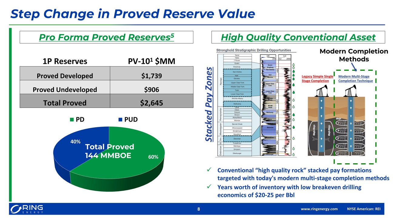 www.ringenergy.com NYSE American: REI 7 Stronghold Energy II Asset Overview Acquisition Highlights x Predictable PDP base with shallow declines & long - life Proved reserves x Meaningful low - risk, high rate - of - return inventory x Margin enhancing ownership with high NRI’s, x Stacked pay zones in most active CBP county x Lower cost - structure significantly enhances free cash flow x Accretive, capital efficient investment inventory enhances free cash flow through future capital program discipline and optimization Asset Details Current Production ( Boe /d) ~9,100 Boe /d PD Reserves 5 MMBOE / PV - 10 1 ($MM) 41.2 / $719 Proved Reserves 5 MMBOE / PV - 10 1 ($MM) 66.6 / $971.5 Total Net Acres ~37,000 % HBP / % Operated 99% / 99% Producing Wells ~605 Avg WI/NRI 99% / ~88%oil & 96% gas 44% 56% Recompletions Vertical New Drill Locations Inventory 500+ Net Production & Inventory by Category Boe /d ~ 9,100 21% 54% 25% NGLs Oil Gas