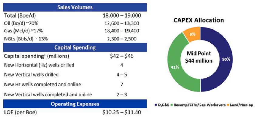 | · | Estimated capital expenditures of $150 million to $175 million that include a balanced and capital efficient combination of drilling Hz wells on legacy assets and vertical wells on the recently acquired CBP assets, as well as performing recompletions and CTRs, with all projects and estimates based on assumed WTI oil prices of $75 to $90 per barrel and Henry Hub natural gas prices of $5 to $6 per Mcf; and |