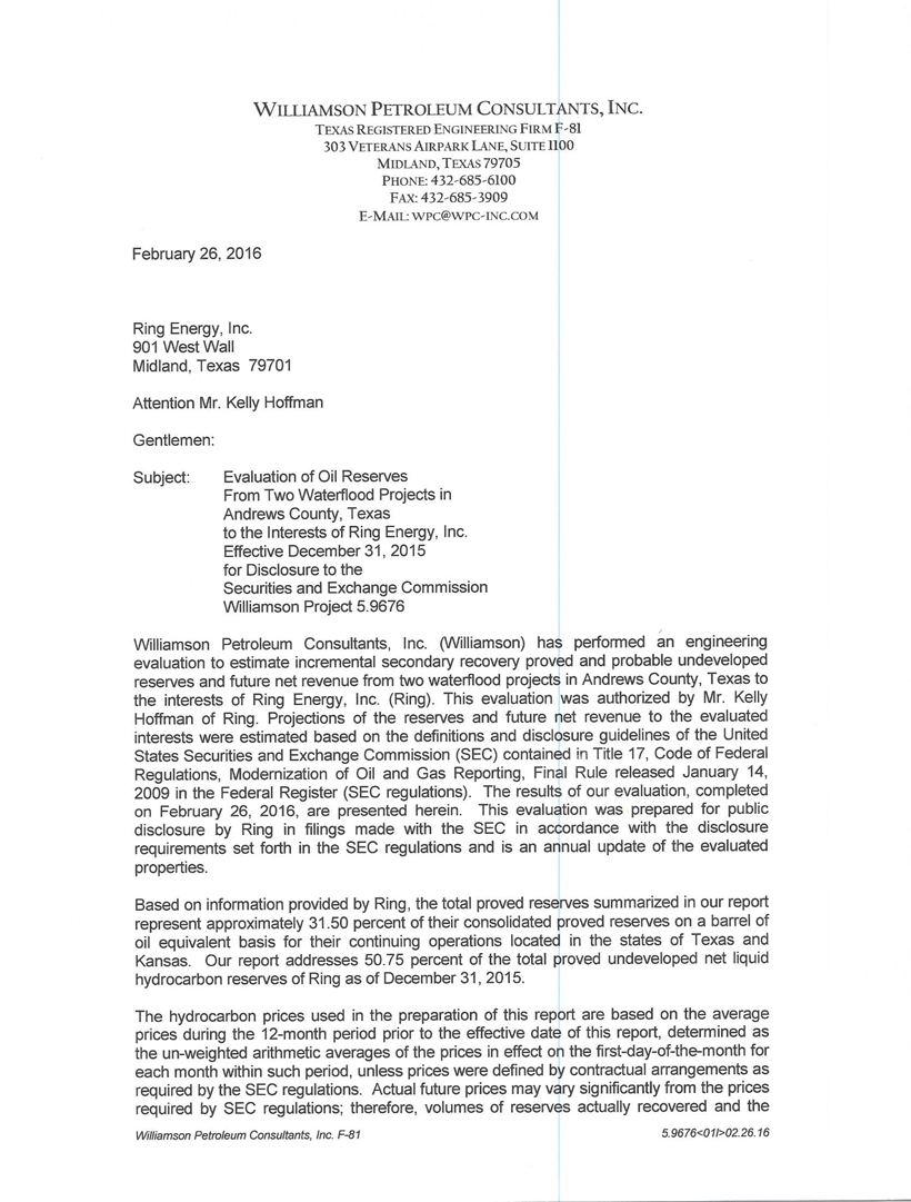 Williamson Petroleum Consultants, Inc. Texas Registered Engineering Firm F-81 303 Veterans Airpark Lane, Suite 1100 Midland, Texas 79705 PHONE: 432-685-6100 FAX: 432-685-3909 E-MAIL: WPC@WPC-INC.COM February 26, 2016 Ring Energy, Inc. 901 West Wall Midland, Texas 79701 Attention Mr. Kelly Hoffman Gentlemen: Subject: Evaluation of Oil Reserves From Two Waterflood Projects in Andrews County, Texas to the Interests of Ring Energy, Inc. Effective December 31, 2015 for Disclosure to the Securities and Exchange Commission Williamson Project 5.9676 Williamson Petroleum Consultants, Inc. (Williamson) has performed an engineering evaluation to estimate incremental secondary recovery proved and probable undeveloped reserves and future net revenue from two waterflood projects in Andrews County, Texas to the interests of Ring Energy, Inc. (Ring). This evaluation was authorized by Mr. Kelly Hoffman of Ring. Projections of the reserves and future net revenue to the evaluated interests were estimated based on the definitions and disclosure guidelines of the United States Securities and Exchange Commission (SEC) contained in Title 17, Code of Federal Regulations, Modernization of Oil and Gas Reporting, Final Rule released January 14, 2009 in the Federal Register (SEC regulations). The results of our evaluation, completed on February 26, 2016, are presented herein. This evaluation was prepared for public disclosure by Ring in filings made with the SEC in accordance with the disclosure requirements set forth in the SEC regulations and is an annual update of the evaluated properties. Based on information provided by Ring, the total proved reserves summarized in our report represent approximately 31.50 percent of their consolidated proved reserves on a barrel of oil equivalent basis for their continuing operations located in the states of Texas and Kansas. Our report addresses 50.75 percent of the total proved undeveloped net liquid hydrocarbon reserves of Ring as of December 31, 2015. 5.9676<01l>02.26.16 The hydrocarbon prices used in the preparation of this report are based on the average prices during the 12-month period prior to the effective date of this report, determined as the un-weighted arithmetic averages of the prices in effect on the first-day-of-the-month for each month within such period, unless prices were defined by contractual arrangements as required by the SEC regulations. Actual future prices may vary significantly from the prices required by SEC regulations; therefore, volumes of reserves actually recovered and the Williamson Petroleum Consultants, Inc. F-81