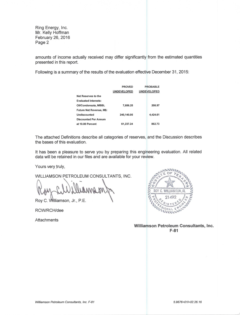Ring Energy, Inc. Mr. Kelly Hoffman February 26, 2016 Page 2 amounts of income actually received may differ significantly from the estimated quantities presented in this report. Following is a summary of the results of the evaluation effective December 31, 2015: PROVED PROBABLE UNDEVELOPED UNDEVELOPED Net Reserves to the Evaluated Interests: Oil/Condensate, MBBL 7,686.25 208.97 Future Net Revenue, M$: Undiscounted 240,140.05 4,424.61 Discounted Per Annum at 10.00 Percent 61,237.24 862.73 The attached Definitions describe all categories of reserves, and the Discussion describes the bases of this evaluation. It has been a pleasure to serve you by preparing this engineering evaluation. All related data will be retained in our files and are available for your review. Yours very truly, WILLIAMSON PETROLEUM CONSULTANTS, INC. Roy C. Williamson, Jr., P.E. RCW/RCH/dee Attachments Williamson Petroleum Consultants, Inc. F-81 Williamson Petroleum Consultants, Inc. F-81