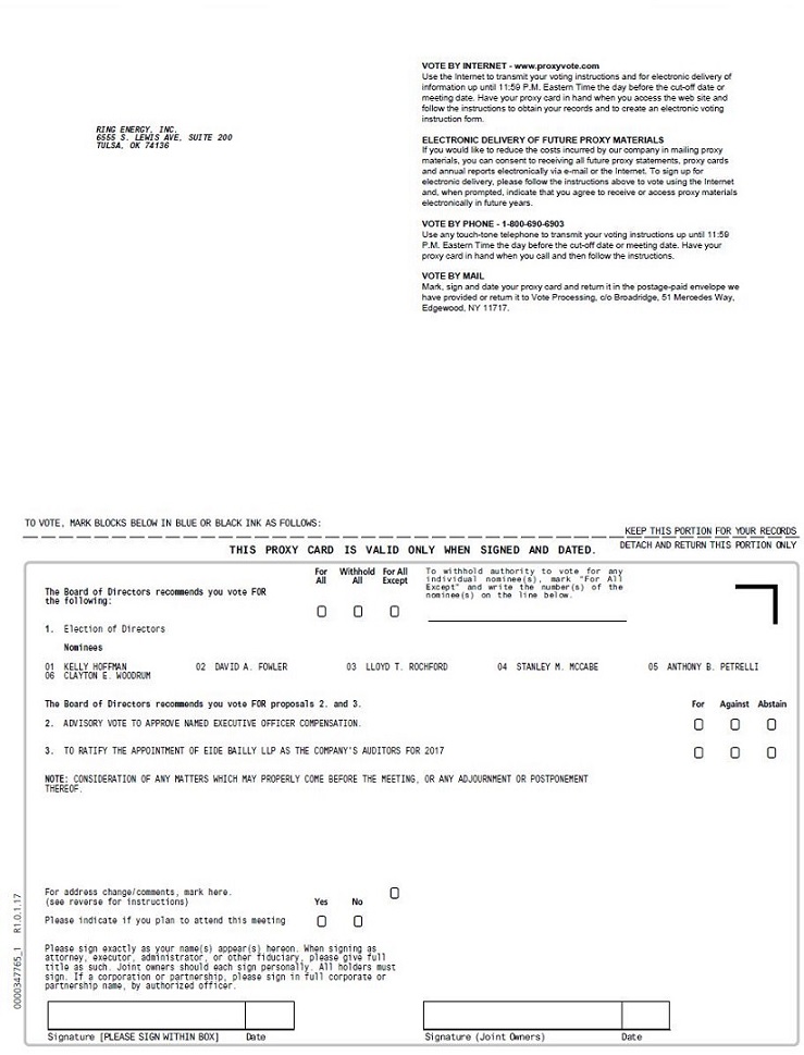 RING ENERGY, INC. 6555 S. LEWIS AVE, SUITE 200 TULSA, OK 74136 VOTE BY INTERNET - www.proxyvote.com Use the Internet to transmit your voting instructions and for electronic delivery of information up until 11:59 P.M. Eastern Time the day before the cut-off date or meeting date. Have your proxy card in hand when you access the web site and follow the instructions to obtain your records and to create an electronic voting instruction form. ELECTRONIC DELIVERY OF FUTURE PROXY MATERIALS If you would like to reduce the costs incurred by our company in mailing proxy materials, you can consent to receiving all future proxy statements, proxy cards and annual reports electronically via e-mail or the Internet. To sign up for electronic delivery, please follow the instructions above to vote using the Internet and, when prompted, indicate that you agree to receive or access proxy materials electronically in future years. VOTE BY PHONE - 1-800-690-6903 Use any touch-tone telephone to transmit your voting instructions up until 11:59 P.M. Eastern Time the day before the cut-off date or meeting date. Have your proxy card in hand when you call and then follow the instructions. VOTE BY MAIL Mark, sign and date your proxy card and return it in the postage-paid envelope we have provided or return it to Vote Processing, c/o Broadridge, 51 Mercedes Way, Edgewood, NY 11717. TO VOTE, MARK BLOCKS BELOW IN BLUE OR BLACK INK AS FOLLOWS: KEEP THIS PORTION FOR YOUR RECORDS DETACH AND RETURN THIS PORTION ONLY THIS PROXY CARD IS VALID ONLY WHEN SIGNED AND DATED. For All Withhold All For All Except The Board of Directors recommends you vote FOR the following: 1. Election of Directors Nominees 01 KELLY HOFFMAN 02 DAVID A. FOWLER 03 LLOYD T. ROCHFORD 04 STANLEY M. MCCABE 05 ANTHONY B. PETRELLI 06 CLAYTON E. WOODRUM For Against Abstain The Board of Directors recommends you vote FOR proposals 2. and 3. 2. ADVISORY VOTE TO APPROVE NAMED EXECUTIVE OFFICER COMPENSATION. 3. TO RATIFY THE APPOINTMENT OF EIDE BAILLY LLP AS THE COMPANY'S AUDITORS FOR 2017 NOTE: CONSIDERATION OF ANY MATTERS WHICH MAY PROPERLY COME BEFORE THE MEETING, OR ANY ADJOURNMENT OR POSTPONEMENT THEREOF. For address change/comments, mark here. (see reverse for instructions) Yes No Please indicate if you plan to attend this meeting Please sign exactly as your name(s) appear(s) hereon. When signing as attorney, executor, administrator, or other fiduciary, please give full title as such. Joint owners should each sign personally. All holders must sign. If a corporation or partnership, please sign in full corporate or partnership name, by authorized officer. Signature [PLEASE SIGN WITHIN BOX] Date Signature (Joint Owners) Date