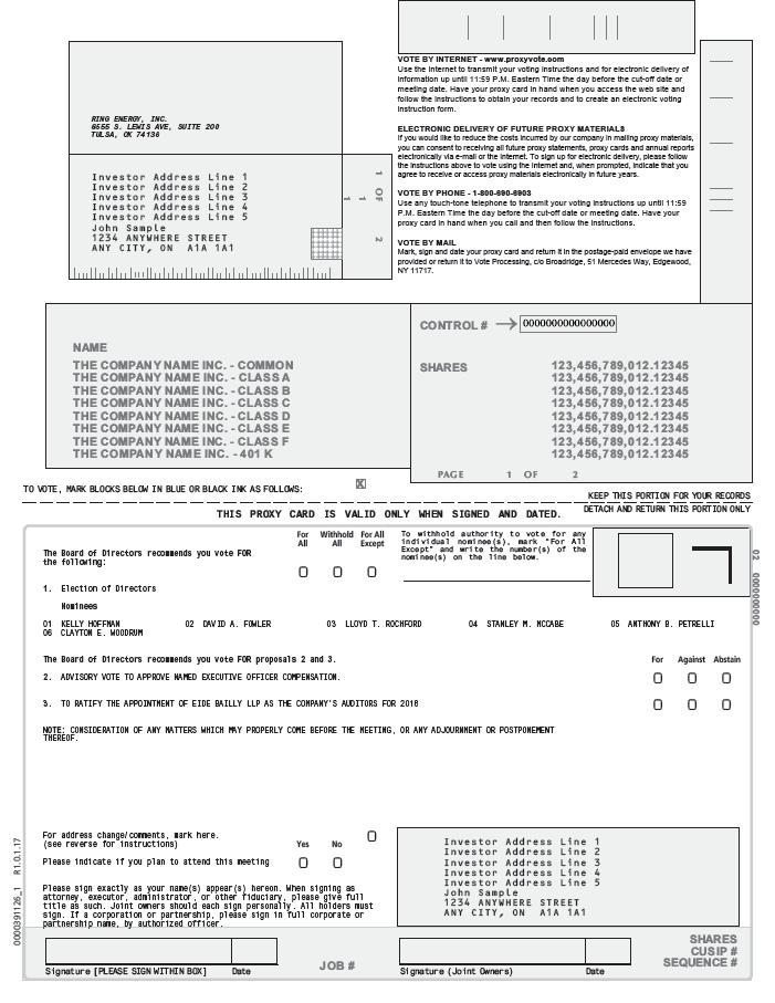 111234567812345678123456781234567812345678123456781234567812345678NAMETHE COMPANY NAME INC. - COMMON123,456,789,012.12345THE COMPANY NAME INC. - CLASS A123,456,789,012.12345THE COMPANY NAME INC. - CLASS B123,456,789,012.12345THE COMPANY NAME INC. - CLASS C123,456,789,012.12345THE COMPANY NAME INC. - CLASS D123,456,789,012.12345THE COMPANY NAME INC. - CLASS E123,456,789,012.12345THE COMPANY NAME INC. - CLASS F123,456,789,012.12345THE COMPANY NAME INC. - 401 K123,456,789,012.12345→x020000000000JOB #1 OF 21 OF 2PAGESHARESCUSIP #SEQUENCE #THIS PROXY CARD IS VALID ONLY WHEN SIGNED AND DATED.KEEP THIS PORTION FOR YOUR RECORDSDETACH AND RETURN THIS PORTION ONLYTO VOTE, MARK BLOCKS BELOW IN BLUE OR BLACK INK AS FOLLOWS:Signature (Joint Owners)Signature [PLEASE SIGN WITHIN BOX]DateDateCONTROL #SHARESTo withhold authority to vote for anyindividual nominee(s), mark “For AllExcept” and write the number(s) of thenominee(s) on the line below. 0 0 0 0 0 0 0 0 0 0 0 00000391126_1 R1.0.1.17ForWithholdFor AllAllAllExceptThe Board of Directors recommends you vote FORthe following:1. Election of Directors Nominees01 KELLY HOFFMAN02 DAVID A. FOWLER03 LLOYD T. ROCHFORD04 STANLEY M. MCCABE05 ANTHONY B. PETRELLI06 CLAYTON E. WOODRUMRING ENERGY, INC.6555 S. LEWIS AVE, SUITE 200TULSA, OK 74136Investor Address Line 1Investor Address Line 2Investor Address Line 3Investor Address Line 4Investor Address Line 5John Sample1234 ANYWHERE STREETANY CITY, ON A1A 1A1Investor Address Line 1Investor Address Line 2Investor Address Line 3Investor Address Line 4Investor Address Line 5John Sample1234 ANYWHERE STREETANY CITY, ON A1A 1A1VOTE BY INTERNET - www.proxyvote.comUse the Internet to transmit your voting instructions and for electronic delivery ofinformation up until 11:59 P.M. Eastern Time the day before the cut-off date ormeeting date. Have your proxy card in hand when you access the web site andfollow the instructions to obtain your records and to create an electronic votinginstruction form.ELECTRONIC DELIVERY OF FUTURE PROXY MATERIALSIf you would like to reduce the costs incurred by our company in mailing proxy materials,you can consent to receiving all future proxy statements, proxy cards and annual reportselectronically via e-mail or the Internet. To sign up for electronic delivery, please followthe instructions above to vote using the Internet and, when prompted, indicate that youagree to receive or access proxy materials electronically in future years.VOTE BY PHONE - 1-800-690-6903Use any touch-tone telephone to transmit your voting instructions up until 11:59P.M. Eastern Time the day before the cut-off date or meeting date. Have yourproxy card in hand when you call and then follow the instructions.VOTE BY MAILMark, sign and date your proxy card and return it in the postage-paid envelope we haveprovided or return it to Vote Processing, c/o Broadridge, 51 Mercedes Way, Edgewood,NY 11717.The Board of Directors recommends you vote FOR proposals 2 and 3.ForAgainstAbstain2. ADVISORY VOTE TO APPROVE NAMED EXECUTIVE OFFICER COMPENSATION.3. TO RATIFY THE APPOINTMENT OF EIDE BAILLY LLP AS THE COMPANY'S AUDITORS FOR 2018NOTE: CONSIDERATION OF ANY MATTERS WHICH MAY PROPERLY COME BEFORE THE MEETING, OR ANY ADJOURNMENT OR POSTPONEMENTTHEREOF.Please sign exactly as your name(s) appear(s) hereon. When signing asattorney, executor, administrator, or other fiduciary, please give fulltitle as such. Joint owners should each sign personally. All holders mustsign. If a corporation or partnership, please sign in full corporate orpartnership name, by authorized officer.For address change/comments, mark here.(see reverse for instructions)YesNoPlease indicate if you plan to attend this meeting