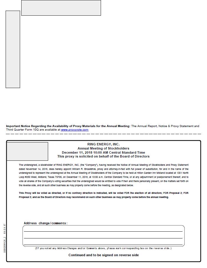 Important Notice Regarding the Availability of Proxy Materials for the Annual Meeting:The Annual Report, Notice & Proxy Statement andThird Quarter Form 10Q are available atwww.proxyvote.com RING ENERGY, INC.Annual Meeting of StockholdersDecember 11, 2018 10:00 AM Central Standard TimeThis proxy is solicited on behalf of the Board of Directors Theundersigned,astockholderofRINGENERGY,INC.(the“Company”),havingreceivedtheNoticeofAnnualMeetingofStockholdersandProxyStatementdatedNovember14,2018,doesherebyappointWilliamR.Broaddrick,proxyandattorney-in-factwithfullpowerofsubstitution,forandinthenameoftheundersignedtorepresenttheundersignedattheAnnualMeetingofStockholdersoftheCompanytobeheldatHiltonGardenInnMidlandlocatedat1301NorthLoop#250West,Midland,Texas79706,onDecember11,2018,at10:00a.m.CentralStandardTime,oratanyadjournmentorpostponementthereof,andtovoteallsharesoftheCompany’svotingsecuritiesthattheundersignedwouldbeentitledtovoteifthenandtherepersonallypresent,onthematterssetforthonthe reverse side, and all such other business as may properly come before the meeting, as designated below.ThisProxywillbevotedasdirected,orifnocontrarydirectionisindicated,willbevotedFORtheelectionofalldirectors;FORProposal2;FORProposal 3; and as the Board of Directors may recommend on such other business as may properly come before the annual meeting. Address change/comments: (If you noted any Address Changes and/or Comments above, please mark corresponding box on the reverse side.) Continued and to be signed on reverse side