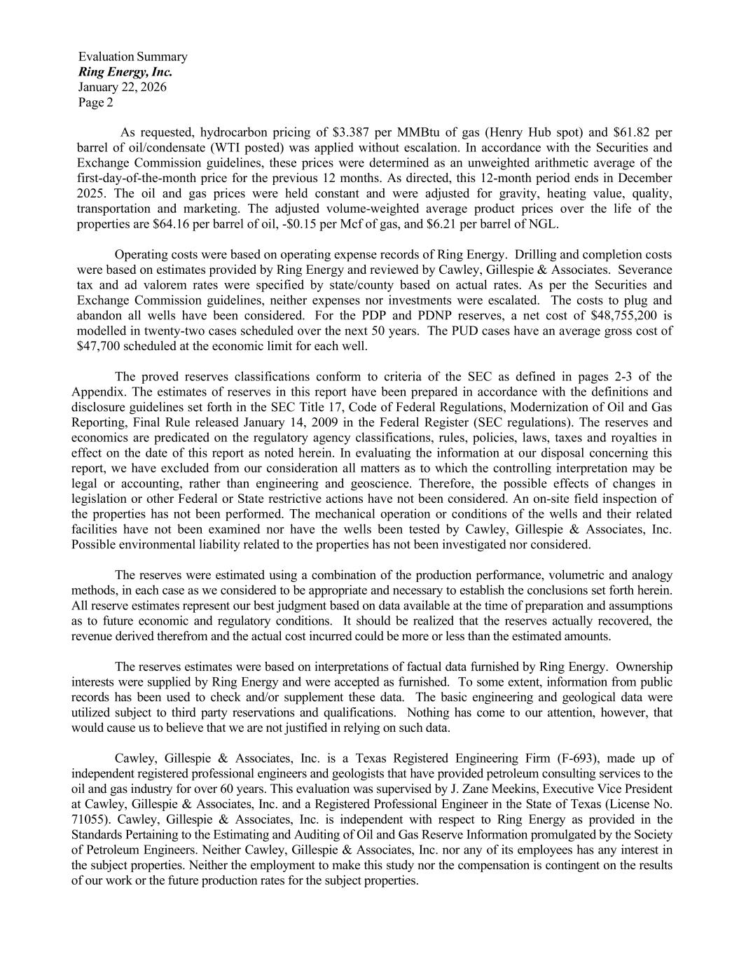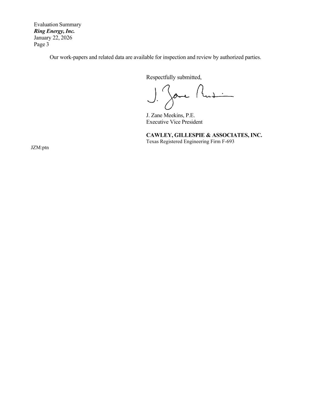 Evaluation Summary Ring Energy, Inc. January 22, 2026 Page 3 Our work-papers and related data are available for inspection and review by authorized parties. Respectfully submitted, J. Zane Meekins, P.E. Executive Vice President CAWLEY, GILLESPIE & ASSOCIATES, INC. Texas Registered Engineering Firm F-693 JZM:ptn