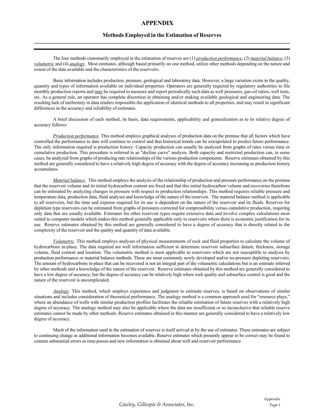 APPENDIX Appendix Page 1 Cawley, Gillespie & Associates, Inc. Methods Employed in the Estimation of Reserves The four methods customarily employed in the estimation of reserves are (1) production performance, (2) material balance, (3) volumetric and (4) analogy. Most estimates, although based primarily on one method, utilize other methods depending on the nature and extent of the data available and the characteristics of the reservoirs. Basic information includes production, pressure, geological and laboratory data. However, a large variation exists in the quality, quantity and types of information available on individual properties. Operators are generally required by regulatory authorities to file monthly production reports and may be required to measure and report periodically such data as well pressures, gas-oil ratios, well tests, etc. As a general rule, an operator has complete discretion in obtaining and/or making available geological and engineering data. The resulting lack of uniformity in data renders impossible the application of identical methods to all properties, and may result in significant differences in the accuracy and reliability of estimates. A brief discussion of each method, its basis, data requirements, applicability and generalization as to its relative degree of accuracy follows: Production performance. This method employs graphical analyses of production data on the premise that all factors which have controlled the performance to date will continue to control and that historical trends can be extrapolated to predict future performance. The only information required is production history. Capacity production can usually be analyzed from graphs of rates versus time or cumulative production. This procedure is referred to as "decline curve" analysis. Both capacity and restricted production can, in some cases, be analyzed from graphs of producing rate relationships of the various production components. Reserve estimates obtained by this method are generally considered to have a relatively high degree of accuracy with the degree of accuracy increasing as production history accumulates. Material balance. This method employs the analysis of the relationship of production and pressure performance on the premise that the reservoir volume and its initial hydrocarbon content are fixed and that this initial hydrocarbon volume and recoveries therefrom can be estimated by analyzing changes in pressure with respect to production relationships. This method requires reliable pressure and temperature data, production data, fluid analyses and knowledge of the nature of the reservoir. The material balance method is applicable to all reservoirs, but the time and expense required for its use is dependent on the nature of the reservoir and its fluids. Reserves for depletion type reservoirs can be estimated from graphs of pressures corrected for compressibility versus cumulative production, requiring only data that are usually available. Estimates for other reservoir types require extensive data and involve complex calculations most suited to computer models which makes this method generally applicable only to reservoirs where there is economic justification for its use. Reserve estimates obtained by this method are generally considered to have a degree of accuracy that is directly related to the complexity of the reservoir and the quality and quantity of data available. Volumetric. This method employs analyses of physical measurements of rock and fluid properties to calculate the volume of hydrocarbons in-place. The data required are well information sufficient to determine reservoir subsurface datum, thickness, storage volume, fluid content and location. The volumetric method is most applicable to reservoirs which are not susceptible to analysis by production performance or material balance methods. These are most commonly newly developed and/or no-pressure depleting reservoirs. The amount of hydrocarbons in-place that can be recovered is not an integral part of the volumetric calculations but is an estimate inferred by other methods and a knowledge of the nature of the reservoir. Reserve estimates obtained by this method are generally considered to have a low degree of accuracy; but the degree of accuracy can be relatively high where rock quality and subsurface control is good and the nature of the reservoir is uncomplicated. Analogy. This method, which employs experience and judgment to estimate reserves, is based on observations of similar situations and includes consideration of theoretical performance. The analogy method is a common approach used for “resource plays,” where an abundance of wells with similar production profiles facilitates the reliable estimation of future reserves with a relatively high degree of accuracy. The analogy method may also be applicable where the data are insufficient or so inconclusive that reliable reserve estimates cannot be made by other methods. Reserve estimates obtained in this manner are generally considered to have a relatively low degree of accuracy. Much of the information used in the estimation of reserves is itself arrived at by the use of estimates. These estimates are subject to continuing change as additional information becomes available. Reserve estimates which presently appear to be correct may be found to contain substantial errors as time passes and new information is obtained about well and reservoir performance.