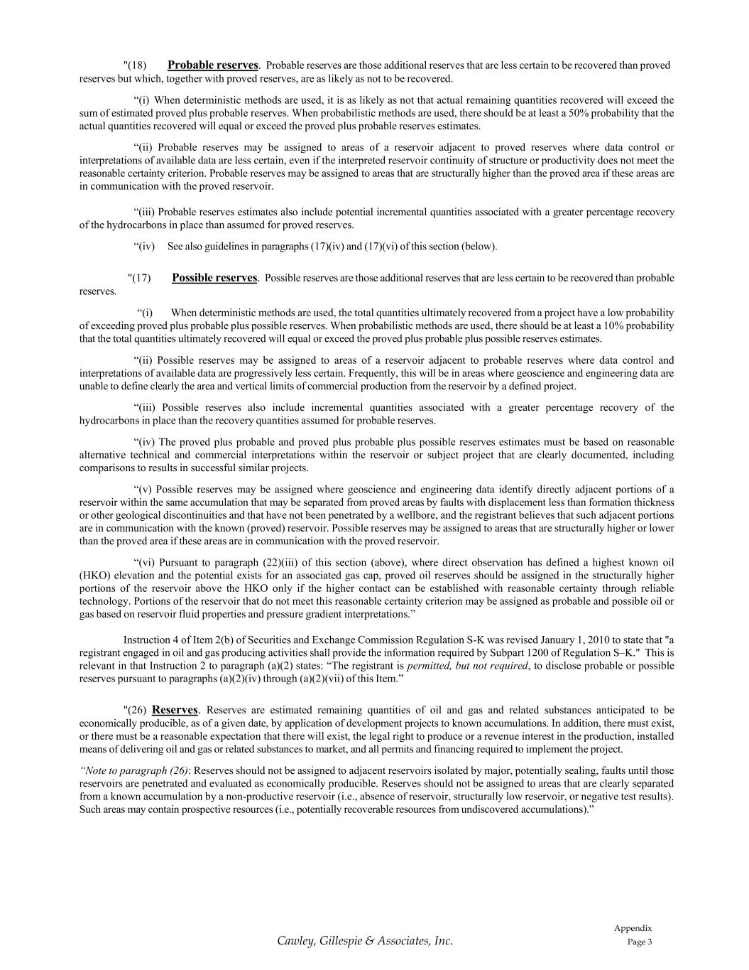 Appendix Page 3 Cawley, Gillespie & Associates, Inc. "(18) Probable reserves. Probable reserves are those additional reserves that are less certain to be recovered than proved reserves but which, together with proved reserves, are as likely as not to be recovered. “(i) When deterministic methods are used, it is as likely as not that actual remaining quantities recovered will exceed the sum of estimated proved plus probable reserves. When probabilistic methods are used, there should be at least a 50% probability that the actual quantities recovered will equal or exceed the proved plus probable reserves estimates. “(ii) Probable reserves may be assigned to areas of a reservoir adjacent to proved reserves where data control or interpretations of available data are less certain, even if the interpreted reservoir continuity of structure or productivity does not meet the reasonable certainty criterion. Probable reserves may be assigned to areas that are structurally higher than the proved area if these areas are in communication with the proved reservoir. “(iii) Probable reserves estimates also include potential incremental quantities associated with a greater percentage recovery of the hydrocarbons in place than assumed for proved reserves. “(iv) See also guidelines in paragraphs (17)(iv) and (17)(vi) of this section (below). reserves. "(17) Possible reserves. Possible reserves are those additional reserves that are less certain to be recovered than probable “(i) When deterministic methods are used, the total quantities ultimately recovered from a project have a low probability of exceeding proved plus probable plus possible reserves. When probabilistic methods are used, there should be at least a 10% probability that the total quantities ultimately recovered will equal or exceed the proved plus probable plus possible reserves estimates. “(ii) Possible reserves may be assigned to areas of a reservoir adjacent to probable reserves where data control and interpretations of available data are progressively less certain. Frequently, this will be in areas where geoscience and engineering data are unable to define clearly the area and vertical limits of commercial production from the reservoir by a defined project. “(iii) Possible reserves also include incremental quantities associated with a greater percentage recovery of the hydrocarbons in place than the recovery quantities assumed for probable reserves. “(iv) The proved plus probable and proved plus probable plus possible reserves estimates must be based on reasonable alternative technical and commercial interpretations within the reservoir or subject project that are clearly documented, including comparisons to results in successful similar projects. “(v) Possible reserves may be assigned where geoscience and engineering data identify directly adjacent portions of a reservoir within the same accumulation that may be separated from proved areas by faults with displacement less than formation thickness or other geological discontinuities and that have not been penetrated by a wellbore, and the registrant believes that such adjacent portions are in communication with the known (proved) reservoir. Possible reserves may be assigned to areas that are structurally higher or lower than the proved area if these areas are in communication with the proved reservoir. “(vi) Pursuant to paragraph (22)(iii) of this section (above), where direct observation has defined a highest known oil (HKO) elevation and the potential exists for an associated gas cap, proved oil reserves should be assigned in the structurally higher portions of the reservoir above the HKO only if the higher contact can be established with reasonable certainty through reliable technology. Portions of the reservoir that do not meet this reasonable certainty criterion may be assigned as probable and possible oil or gas based on reservoir fluid properties and pressure gradient interpretations.” Instruction 4 of Item 2(b) of Securities and Exchange Commission Regulation S-K was revised January 1, 2010 to state that "a registrant engaged in oil and gas producing activities shall provide the information required by Subpart 1200 of Regulation S–K." This is relevant in that Instruction 2 to paragraph (a)(2) states: “The registrant is permitted, but not required, to disclose probable or possible reserves pursuant to paragraphs (a)(2)(iv) through (a)(2)(vii) of this Item.” "(26) Reserves. Reserves are estimated remaining quantities of oil and gas and related substances anticipated to be economically producible, as of a given date, by application of development projects to known accumulations. In addition, there must exist, or there must be a reasonable expectation that there will exist, the legal right to produce or a revenue interest in the production, installed means of delivering oil and gas or related substances to market, and all permits and financing required to implement the project. “Note to paragraph (26): Reserves should not be assigned to adjacent reservoirs isolated by major, potentially sealing, faults until those reservoirs are penetrated and evaluated as economically producible. Reserves should not be assigned to areas that are clearly separated from a known accumulation by a non-productive reservoir (i.e., absence of reservoir, structurally low reservoir, or negative test results). Such areas may contain prospective resources (i.e., potentially recoverable resources from undiscovered accumulations).”