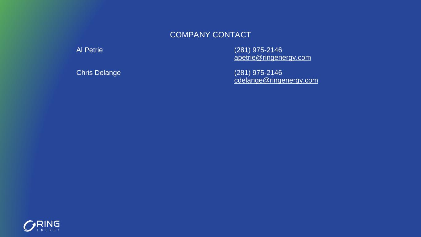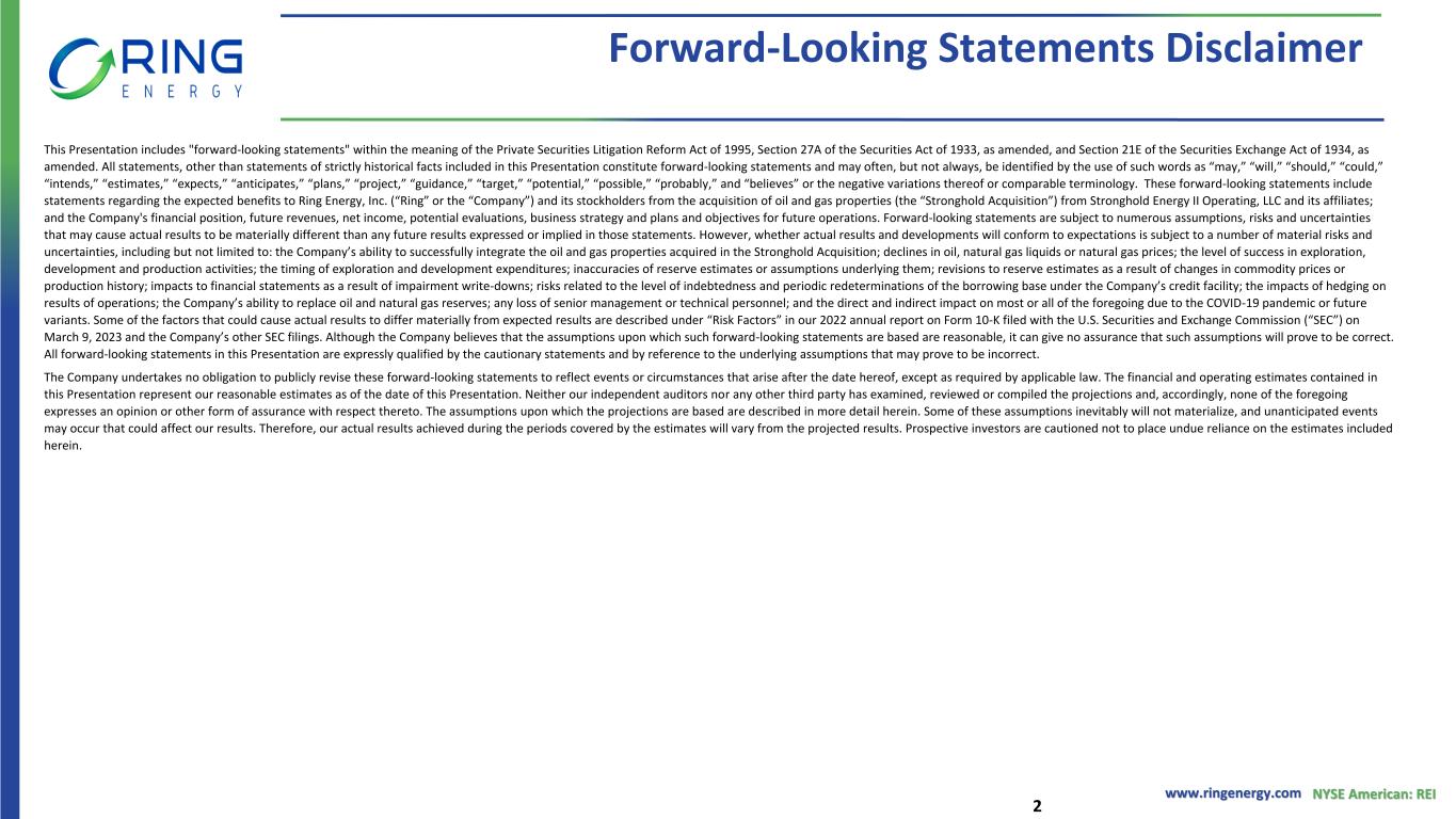 www.ringenergy.com NYSE American: REI Forward-Looking Statements Disclaimer This Presentation includes "forward-looking statements" within the meaning of the Private Securities Litigation Reform Act of 1995, Section 27A of the Securities Act of 1933, as amended, and Section 21E of the Securities Exchange Act of 1934, as amended. All statements, other than statements of strictly historical facts included in this Presentation constitute forward-looking statements and may often, but not always, be identified by the use of such words as “may,” “will,” “should,” “could,” “intends,” “estimates,” “expects,” “anticipates,” “plans,” “project,” “guidance,” “target,” “potential,” “possible,” “probably,” and “believes” or the negative variations thereof or comparable terminology. These forward-looking statements include statements regarding the expected benefits to Ring Energy, Inc. (“Ring” or the “Company”) and its stockholders from the acquisition of oil and gas properties (the “Stronghold Acquisition”) from Stronghold Energy II Operating, LLC and its affiliates; and the Company's financial position, future revenues, net income, potential evaluations, business strategy and plans and objectives for future operations. Forward-looking statements are subject to numerous assumptions, risks and uncertainties that may cause actual results to be materially different than any future results expressed or implied in those statements. However, whether actual results and developments will conform to expectations is subject to a number of material risks and uncertainties, including but not limited to: the Company’s ability to successfully integrate the oil and gas properties acquired in the Stronghold Acquisition; declines in oil, natural gas liquids or natural gas prices; the level of success in exploration, development and production activities; the timing of exploration and development expenditures; inaccuracies of reserve estimates or assumptions underlying them; revisions to reserve estimates as a result of changes in commodity prices or production history; impacts to financial statements as a result of impairment write-downs; risks related to the level of indebtedness and periodic redeterminations of the borrowing base under the Company’s credit facility; the impacts of hedging on results of operations; the Company’s ability to replace oil and natural gas reserves; any loss of senior management or technical personnel; and the direct and indirect impact on most or all of the foregoing due to the COVID-19 pandemic or future variants. Some of the factors that could cause actual results to differ materially from expected results are described under “Risk Factors” in our 2022 annual report on Form 10-K filed with the U.S. Securities and Exchange Commission (“SEC”) on March 9, 2023 and the Company’s other SEC filings. Although the Company believes that the assumptions upon which such forward-looking statements are based are reasonable, it can give no assurance that such assumptions will prove to be correct. All forward-looking statements in this Presentation are expressly qualified by the cautionary statements and by reference to the underlying assumptions that may prove to be incorrect. The Company undertakes no obligation to publicly revise these forward-looking statements to reflect events or circumstances that arise after the date hereof, except as required by applicable law. The financial and operating estimates contained in this Presentation represent our reasonable estimates as of the date of this Presentation. Neither our independent auditors nor any other third party has examined, reviewed or compiled the projections and, accordingly, none of the foregoing expresses an opinion or other form of assurance with respect thereto. The assumptions upon which the projections are based are described in more detail herein. Some of these assumptions inevitably will not materialize, and unanticipated events may occur that could affect our results. Therefore, our actual results achieved during the periods covered by the estimates will vary from the projected results. Prospective investors are cautioned not to place undue reliance on the estimates included herein. 2