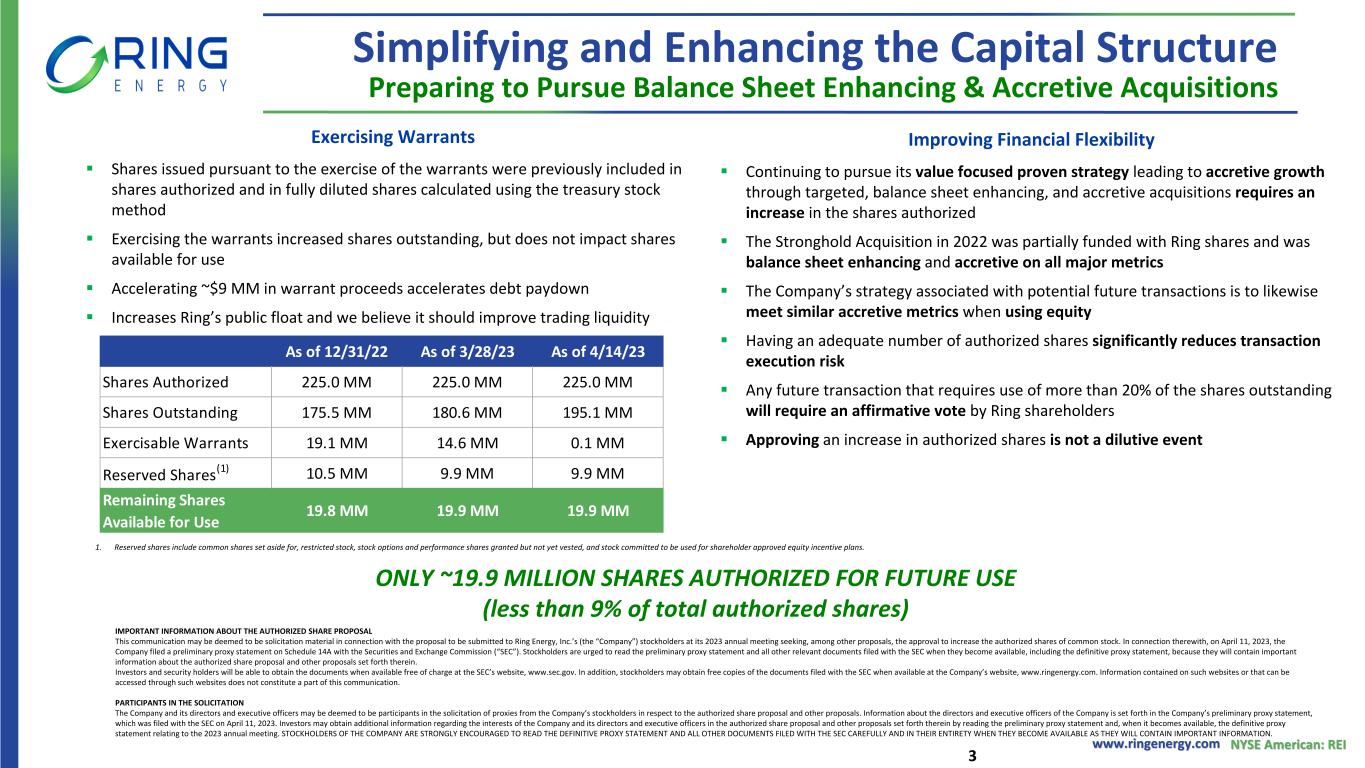 www.ringenergy.com NYSE American: REI Improving Financial Flexibility ▪ Continuing to pursue its value focused proven strategy leading to accretive growth through targeted, balance sheet enhancing, and accretive acquisitions requires an increase in the shares authorized ▪ The Stronghold Acquisition in 2022 was partially funded with Ring shares and was balance sheet enhancing and accretive on all major metrics ▪ The Company’s strategy associated with potential future transactions is to likewise meet similar accretive metrics when using equity ▪ Having an adequate number of authorized shares significantly reduces transaction execution risk ▪ Any future transaction that requires use of more than 20% of the shares outstanding will require an affirmative vote by Ring shareholders ▪ Approving an increase in authorized shares is not a dilutive event Simplifying and Enhancing the Capital Structure 1. Reserved shares include common shares set aside for, restricted stock, stock options and performance shares granted but not yet vested, and stock committed to be used for shareholder approved equity incentive plans. Exercising Warrants ▪ Shares issued pursuant to the exercise of the warrants were previously included in shares authorized and in fully diluted shares calculated using the treasury stock method ▪ Exercising the warrants increased shares outstanding, but does not impact shares available for use ▪ Accelerating ~$9 MM in warrant proceeds accelerates debt paydown ▪ Increases Ring’s public float and we believe it should improve trading liquidity ONLY ~19.9 MILLION SHARES AUTHORIZED FOR FUTURE USE (less than 9% of total authorized shares) Preparing to Pursue Balance Sheet Enhancing & Accretive Acquisitions As of 12/31/22 As of 3/28/23 As of 4/14/23 Shares Authorized 225.0 MM 225.0 MM 225.0 MM Shares Outstanding 175.5 MM 180.6 MM 195.1 MM Exercisable Warrants 19.1 MM 14.6 MM 0.1 MM Reserved Shares (1) 10.5 MM 9.9 MM 9.9 MM Remaining Shares Available for Use 19.8 MM 19.9 MM 19.9 MM IMPORTANT INFORMATION ABOUT THE AUTHORIZED SHARE PROPOSAL This communication may be deemed to be solicitation material in connection with the proposal to be submitted to Ring Energy, Inc.’s (the “Company”) stockholders at its 2023 annual meeting seeking, among other proposals, the approval to increase the authorized shares of common stock. In connection therewith, on April 11, 2023, the Company filed a preliminary proxy statement on Schedule 14A with the Securities and Exchange Commission (“SEC”). Stockholders are urged to read the preliminary proxy statement and all other relevant documents filed with the SEC when they become available, including the definitive proxy statement, because they will contain important information about the authorized share proposal and other proposals set forth therein. Investors and security holders will be able to obtain the documents when available free of charge at the SEC’s website, www.sec.gov. In addition, stockholders may obtain free copies of the documents filed with the SEC when available at the Company’s website, www.ringenergy.com. Information contained on such websites or that can be accessed through such websites does not constitute a part of this communication. PARTICIPANTS IN THE SOLICITATION The Company and its directors and executive officers may be deemed to be participants in the solicitation of proxies from the Company’s stockholders in respect to the authorized share proposal and other proposals. Information about the directors and executive officers of the Company is set forth in the Company’s preliminary proxy statement, which was filed with the SEC on April 11, 2023. Investors may obtain additional information regarding the interests of the Company and its directors and executive officers in the authorized share proposal and other proposals set forth therein by reading the preliminary proxy statement and, when it becomes available, the definitive proxy statement relating to the 2023 annual meeting. STOCKHOLDERS OF THE COMPANY ARE STRONGLY ENCOURAGED TO READ THE DEFINITIVE PROXY STATEMENT AND ALL OTHER DOCUMENTS FILED WITH THE SEC CAREFULLY AND IN THEIR ENTIRETY WHEN THEY BECOME AVAILABLE AS THEY WILL CONTAIN IMPORTANT INFORMATION. 3